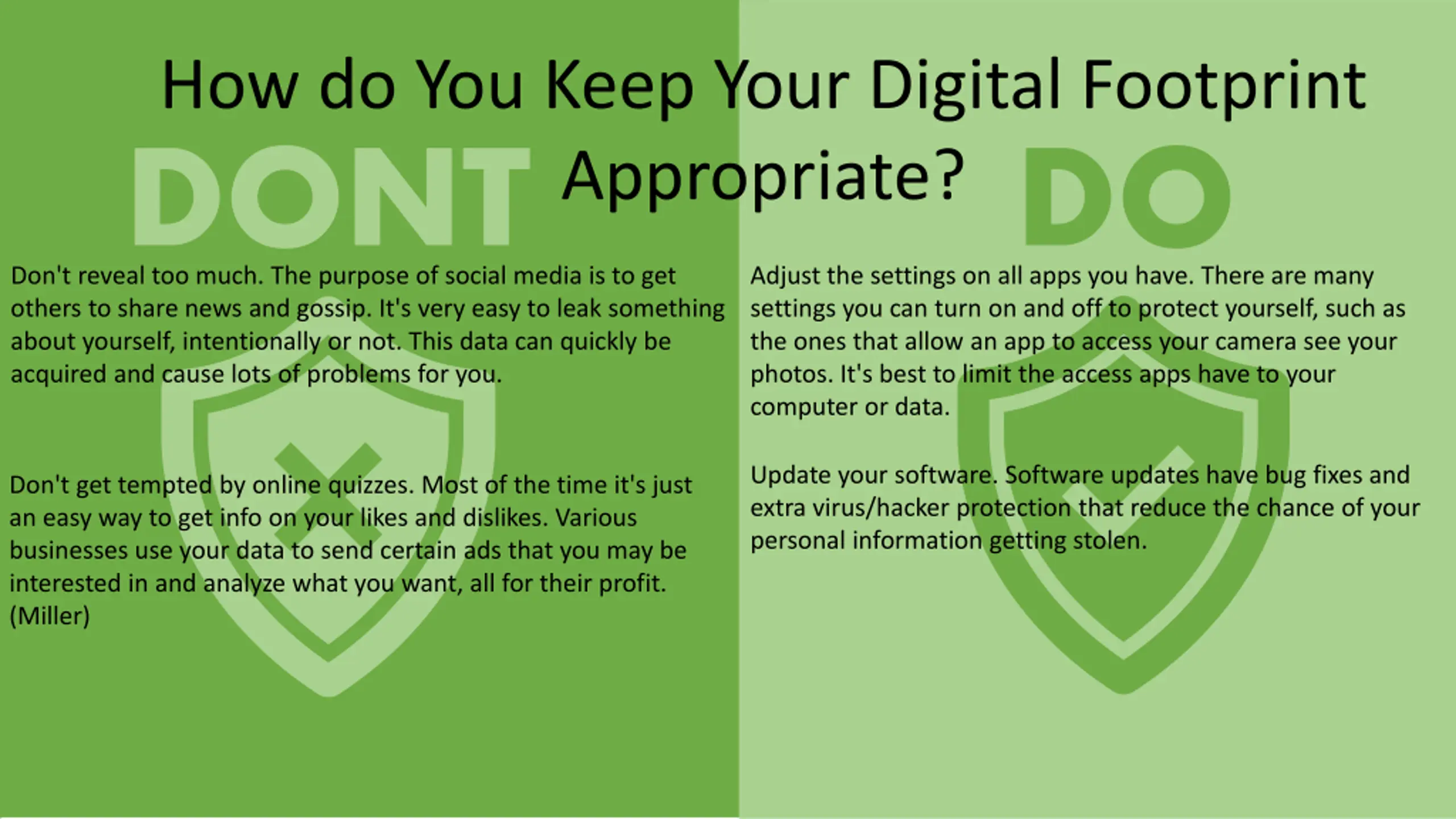 How do You Keep Your Digital Footprint Appropriate? DONT Don't reveal too much. The purpose of social media is to get others to share news and gossip. It's very easy to leak something about yourself, intentionally or not. This data can quickly be acquired and cause lots of problems for you. DO Adjust the settings on all apps you have. There are many settings you can turn on and off to protect yourself, such as the ones that allow an app to access your camera see your photos. It's best to limit the access apps have to your computer or data. Update your software. Software updates have bug fixes and extra virus/hacker protection that reduce the chance of your personal information getting stolen. Don't get tempted by online quizzes. Most of the time it's just an easy way to get info on your likes and dislikes. Various businesses use your data to send certain ads that you may be interested in and analyze what you want, all for their profit. (Miller)