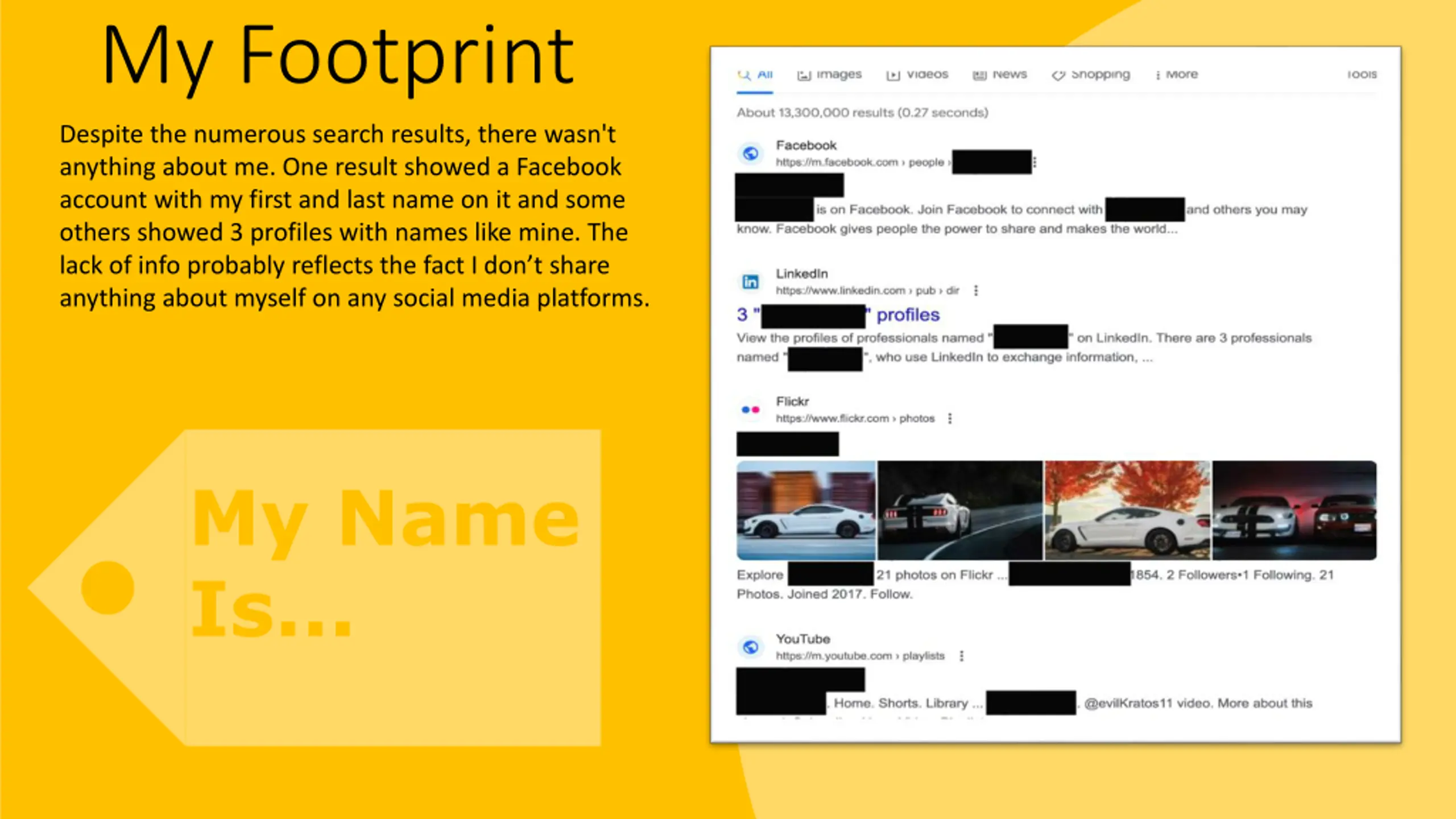 My Footprint Despite the numerous search results, there wasn't anything about me. One result showed a Facebook account with my first and last name on it and some others showed 3 profiles with names like mine. The lack of info probably reflects the fact I don t share anything about myself on any social media platforms. My Name Is...
