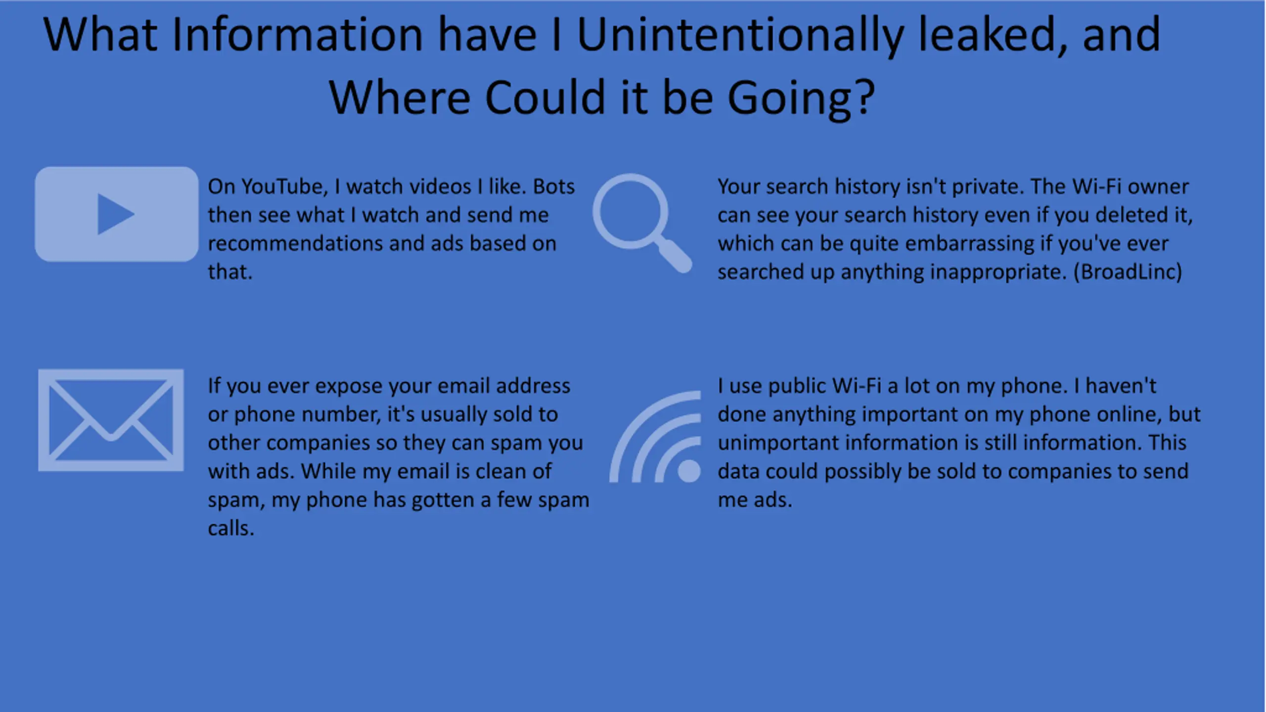What Information have I Unintentionally leaked, and Where Could it be Going? On YouTube, I watch videos I like. Bots then see what I watch and send me recommendations and ads based on that. Your search history isn't private. The Wi-Fi owner can see your search history even if you deleted it, which can be quite embarrassing if you've ever searched up anything inappropriate. (BroadLinc) If you ever expose your email address or phone number, it's usually sold to other companies so they can spam you with ads. While my email is clean of spam, my phone has gotten a few spam calls. I use public Wi-Fi a lot on my phone. I haven't done anything important on my phone online, but unimportant information is still information. This data could possibly be sold to companies to send me ads.