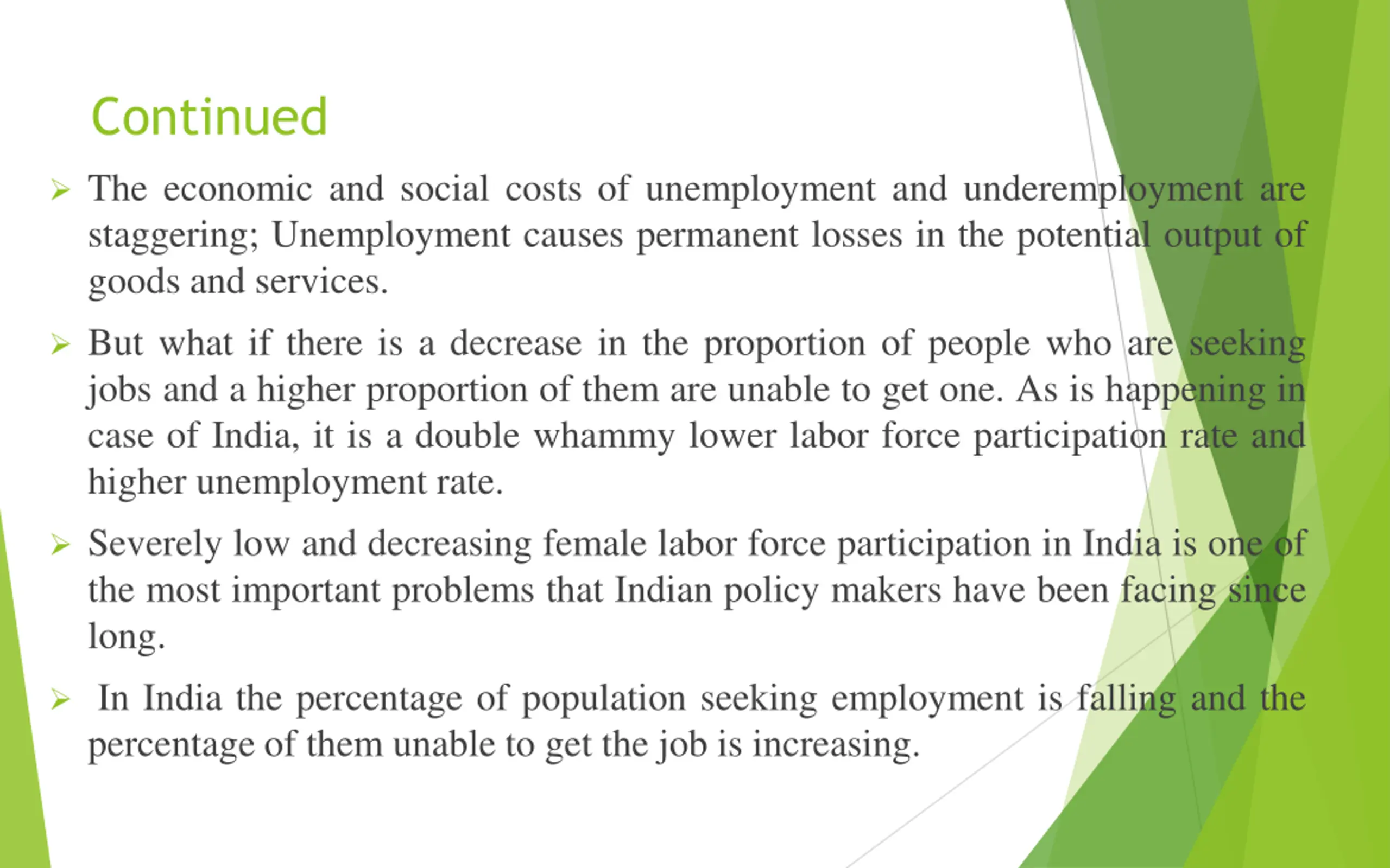 Continued The economic and social costs of unemployment and underemployment are staggering; Unemployment causes permanent losses in the potential output of goods and services. But what if there is a decrease in the proportion of people who are seeking jobs and a higher proportion of them are unable to get one. As is happening in case of India, it is a double whammy lower labor force participation rate and higher unemployment rate. Severely low and decreasing female labor force participation in India is one of the most important problems that Indian policy makers have been facing since long. In India the percentage of population seeking employment is falling and the percentage of them unable to get the job is increasing.