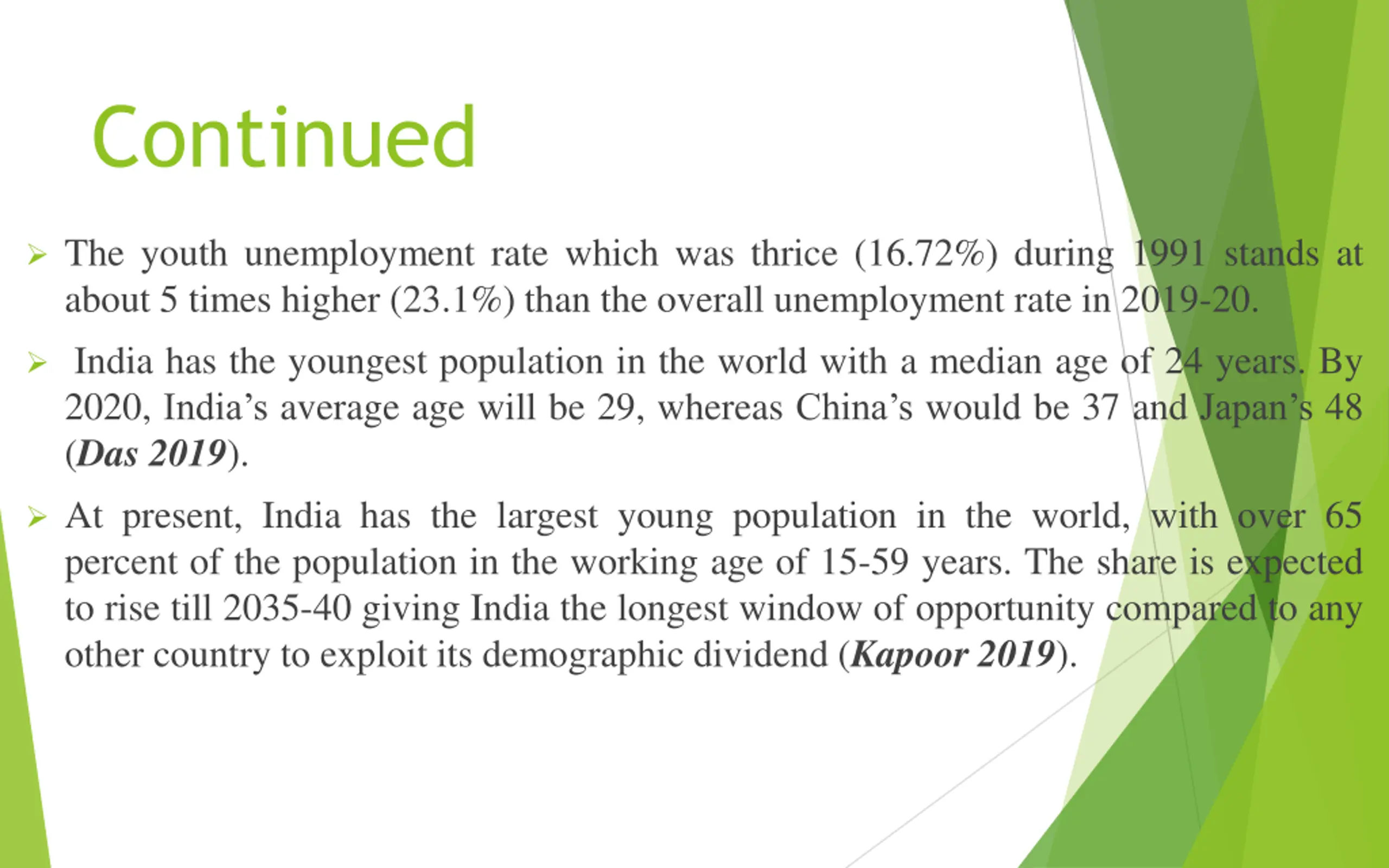 Continued The youth unemployment rate which was thrice (16.72%) during 1991 stands at about 5 times higher (23.1%) than the overall unemployment rate in 2019-20. India has the youngest population in the world with a median age of 24 years. By 2020, India s average age will be 29, whereas China s would be 37 and Japan s 48 (Das 2019). At present, India has the largest young population in the world, with over 65 percent of the population in the working age of 15-59 years. The share is expected to rise till 2035-40 giving India the longest window of opportunity compared to any other country to exploit its demographic dividend (Kapoor 2019).