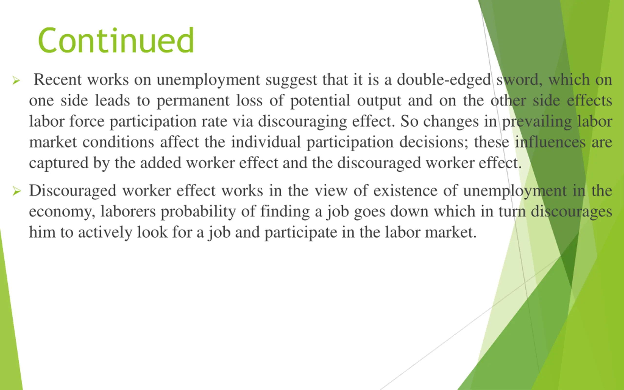 Continued Recent works on unemployment suggest that it is a double-edged sword, which on one side leads to permanent loss of potential output and on the other side effects labor force participation rate via discouraging effect. So changes in prevailing labor market conditions affect the individual participation decisions; these influences are captured by the added worker effect and the discouraged worker effect. Discouraged worker effect works in the view of existence of unemployment in the economy, laborers probability of finding a job goes down which in turn discourages him to actively look for a job and participate in the labor market.