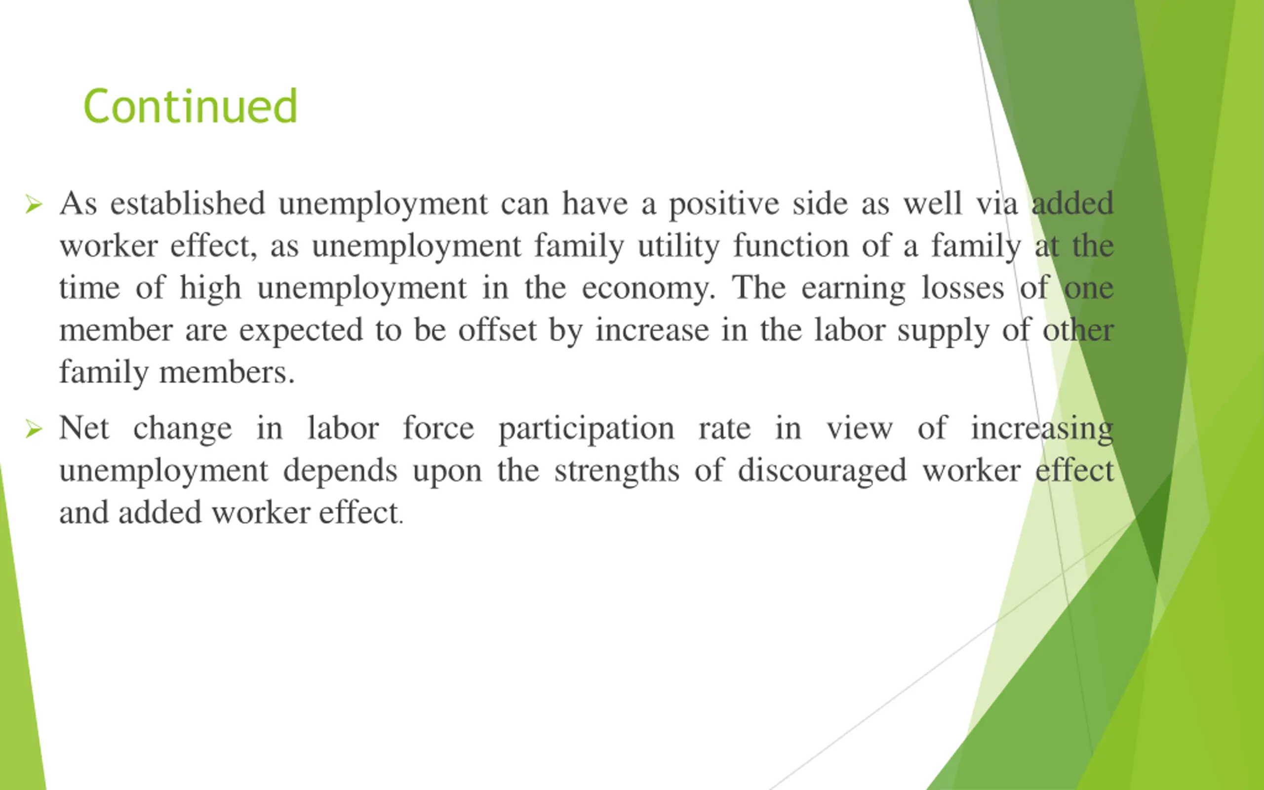Continued As established unemployment can have a positive side as well via added worker effect, as unemployment family utility function of a family at the time of high unemployment in the economy. The earning losses of one member are expected to be offset by increase in the labor supply of other family members. Net change in labor force participation rate in view of increasing unemployment depends upon the strengths of discouraged worker effect and added worker effect.