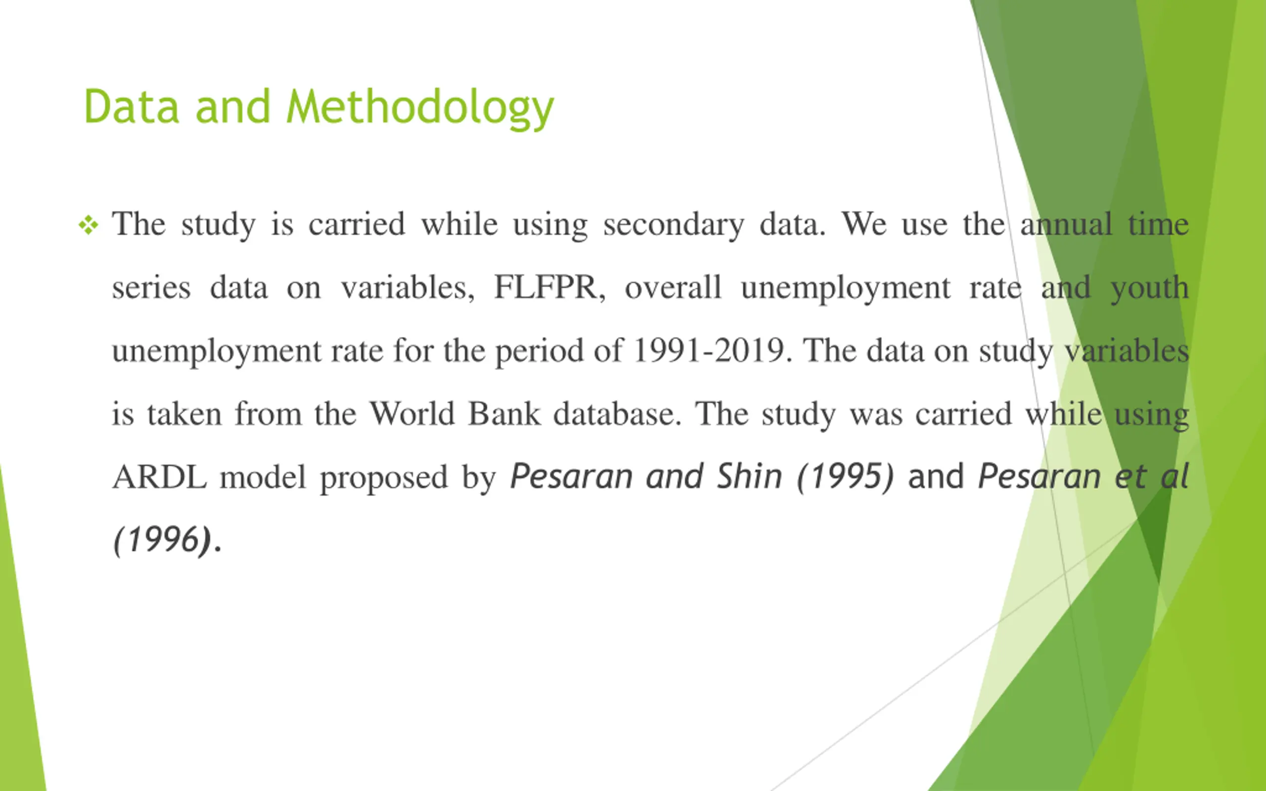 Data and Methodology The study is carried while using secondary data. We use the annual time series data on variables, FLFPR, overall unemployment rate and youth unemployment rate for the period of 1991-2019. The data on study variables is taken from the World Bank database. The study was carried while using ARDL model proposed by Pesaran and Shin (1995) and Pesaran et al (1996).