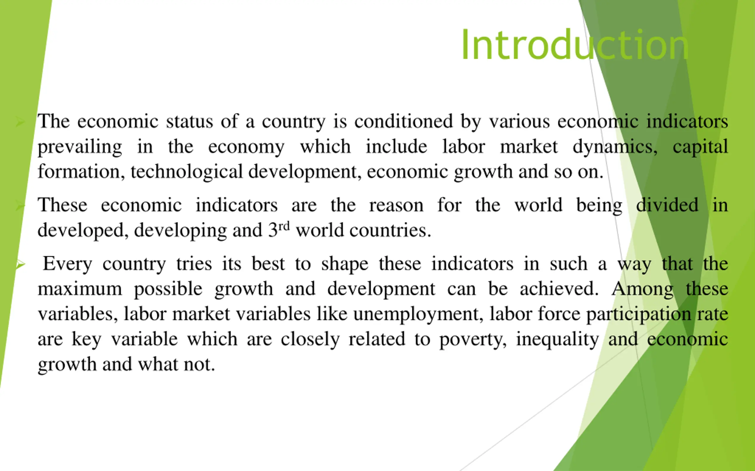 Introduction The economic status of a country is conditioned by various economic indicators prevailing in the economy which include labor market dynamics, capital formation, technological development, economic growth and so on. These economic indicators are the reason for the world being divided in developed, developing and 3rdworld countries. Every country tries its best to shape these indicators in such a way that the maximum possible growth and development can be achieved. Among these variables, labor market variables like unemployment, labor force participation rate are key variable which are closely related to poverty, inequality and economic growth and what not.