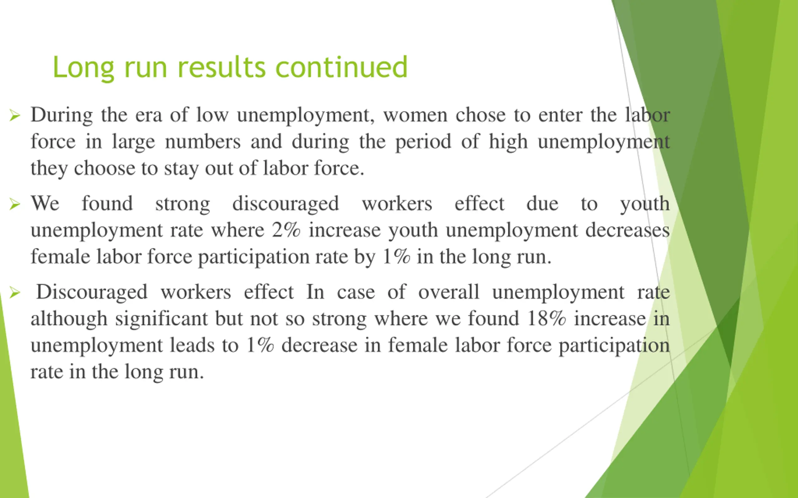 Long run results continued During the era of low unemployment, women chose to enter the labor force in large numbers and during the period of high unemployment they choose to stay out of labor force. found strong discouraged unemployment rate where 2% increase youth unemployment decreases female labor force participation rate by 1% in the long run. We workers effect due to youth Discouraged workers effect In case of overall unemployment rate although significant but not so strong where we found 18% increase in unemployment leads to 1% decrease in female labor force participation rate in the long run.