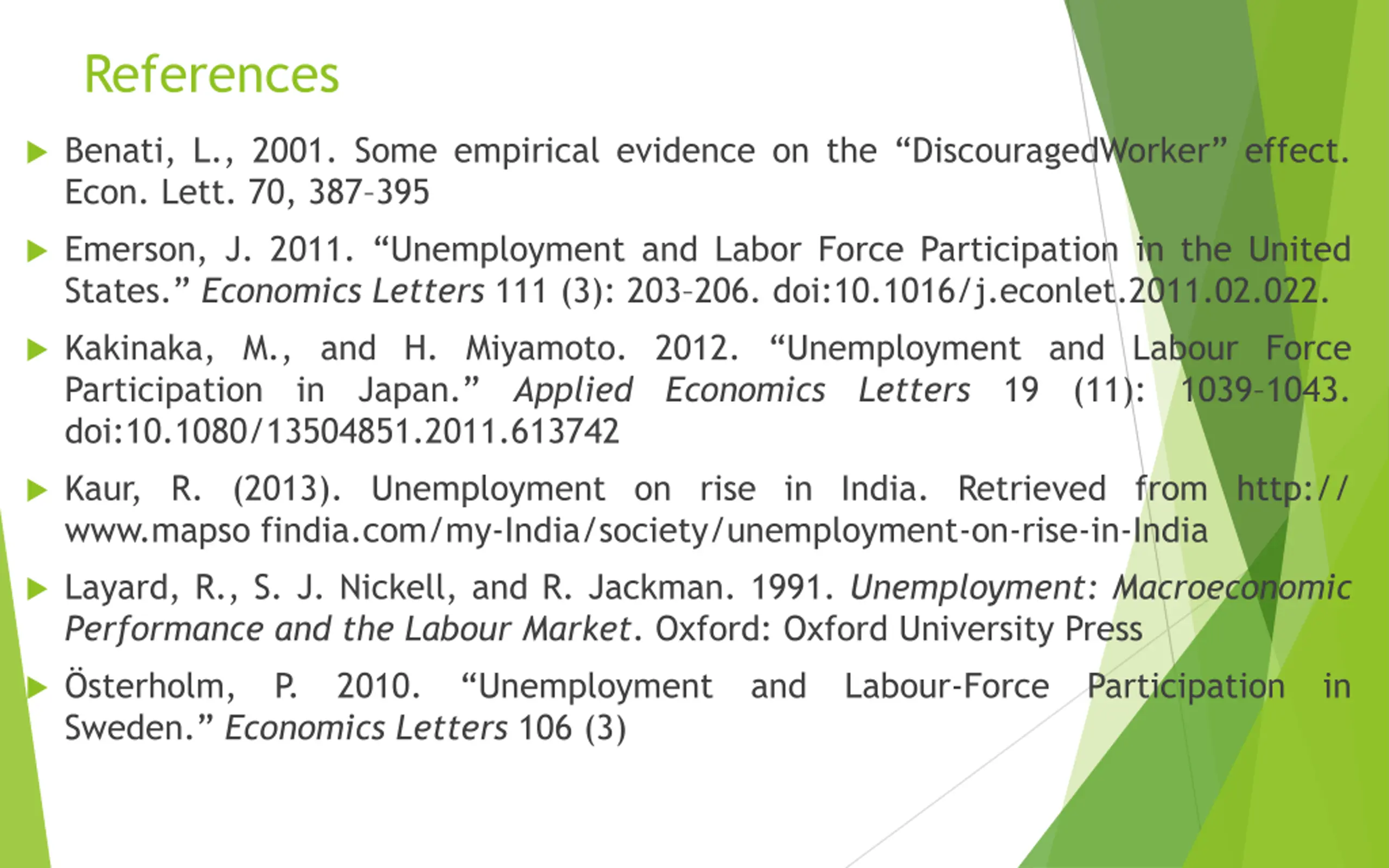 References Benati, L., 2001. Some empirical evidence on the DiscouragedWorker effect. Econ. Lett. 70, 387 395 Emerson, J. 2011. Unemployment and Labor Force Participation in the United States. Economics Letters 111 (3): 203 206. doi:10.1016/j.econlet.2011.02.022. Kakinaka, M., and H. Miyamoto. 2012. Unemployment and Labour Force Participation in Japan. Applied Economics doi:10.1080/13504851.2011.613742 Letters 19 (11): 1039 1043. Kaur, R. (2013). Unemployment on rise in India. Retrieved from http:// www.mapso findia.com/my-India/society/unemployment-on-rise-in-India Layard, R., S. J. Nickell, and R. Jackman. 1991. Unemployment: Macroeconomic Performance and the Labour Market. Oxford: Oxford University Press P. 2010. Unemployment Sweden. Economics Letters 106 (3) sterholm, and Labour-Force Participation in
