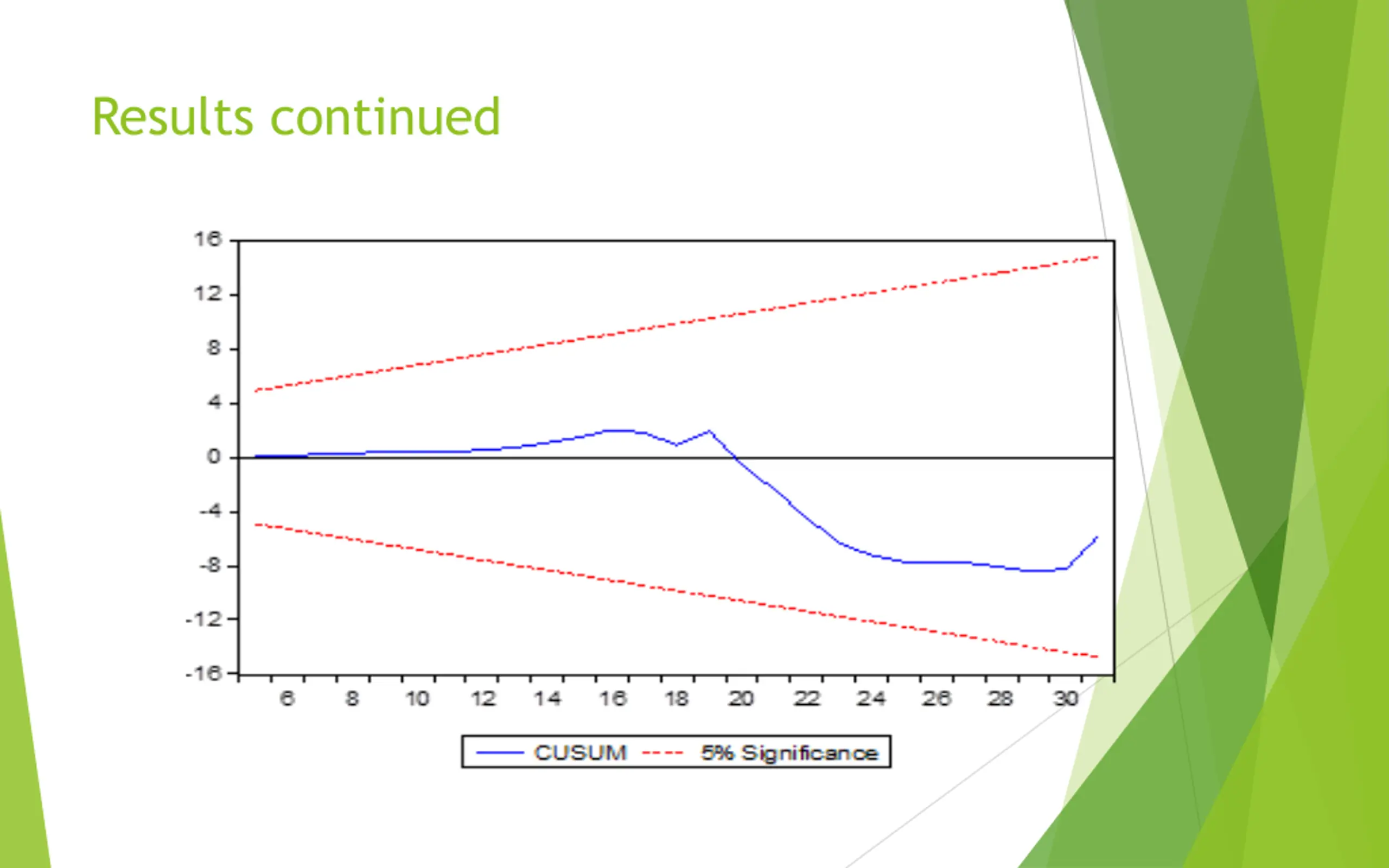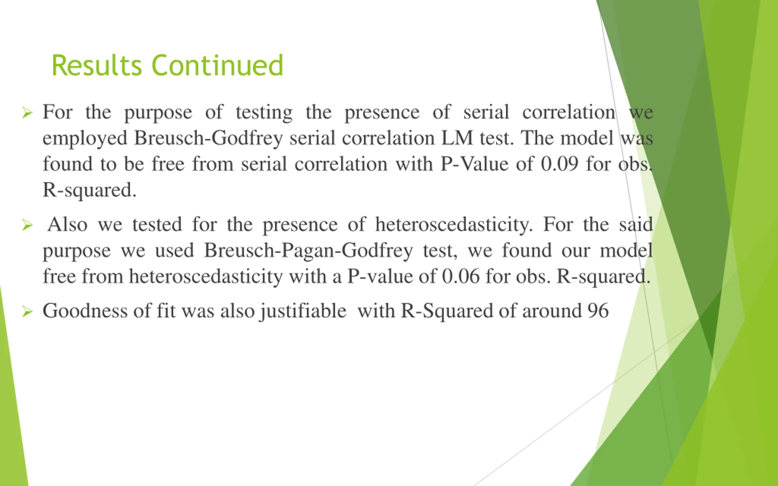 Results Continued For the purpose of testing the presence of serial correlation we employed Breusch-Godfrey serial correlation LM test. The model was found to be free from serial correlation with P-Value of 0.09 for obs. R-squared. Also we tested for the presence of heteroscedasticity. For the said purpose we used Breusch-Pagan-Godfrey test, we found our model free from heteroscedasticity with a P-value of 0.06 for obs. R-squared. Goodness of fit was also justifiable with R-Squared of around 96