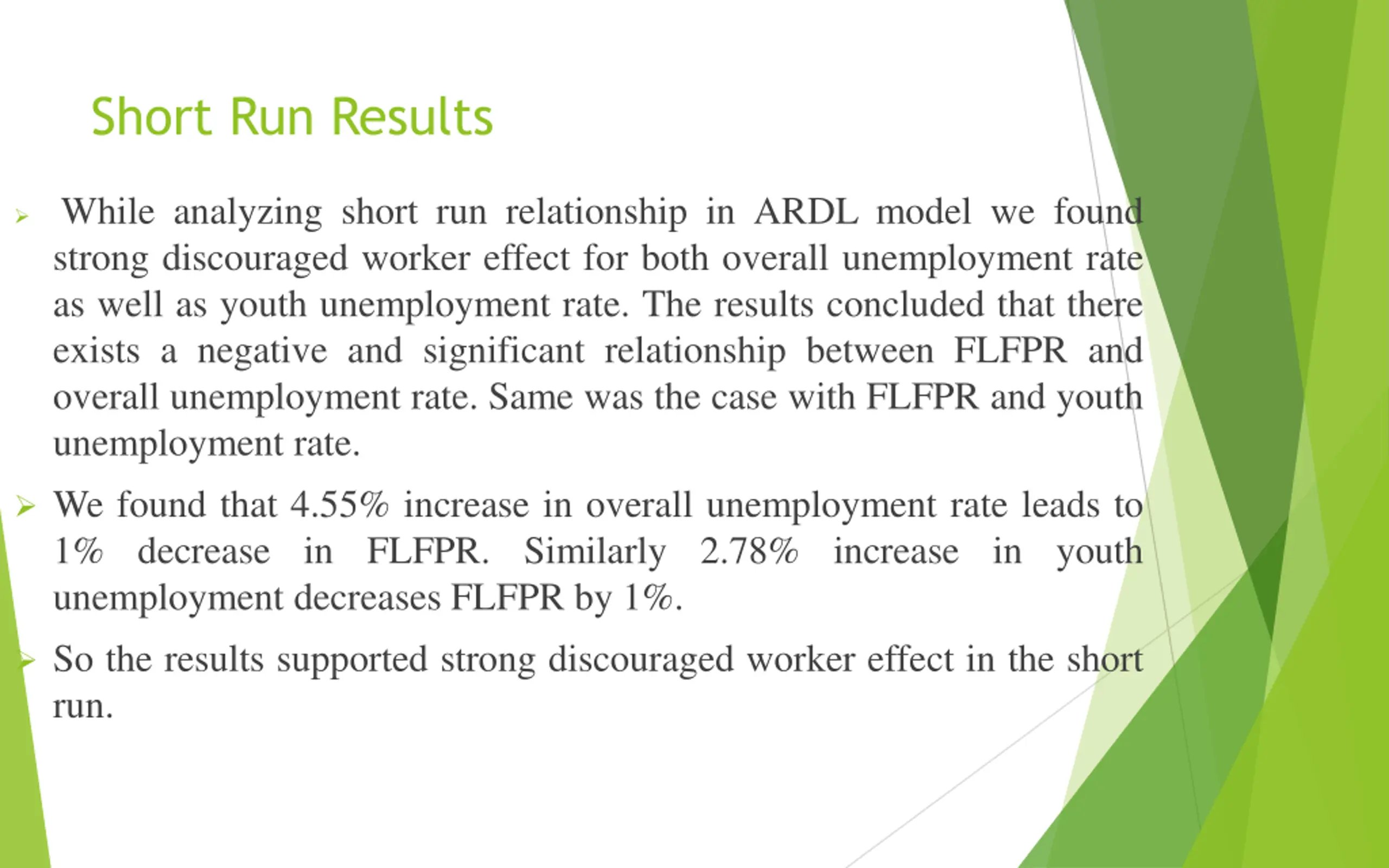Short Run Results While analyzing short run relationship in ARDL model we found strong discouraged worker effect for both overall unemployment rate as well as youth unemployment rate. The results concluded that there exists a negative and significant relationship between FLFPR and overall unemployment rate. Same was the case with FLFPR and youth unemployment rate. We found that 4.55% increase in overall unemployment rate leads to 1% decrease in FLFPR. Similarly 2.78% increase in youth unemployment decreases FLFPR by 1%. So the results supported strong discouraged worker effect in the short run.