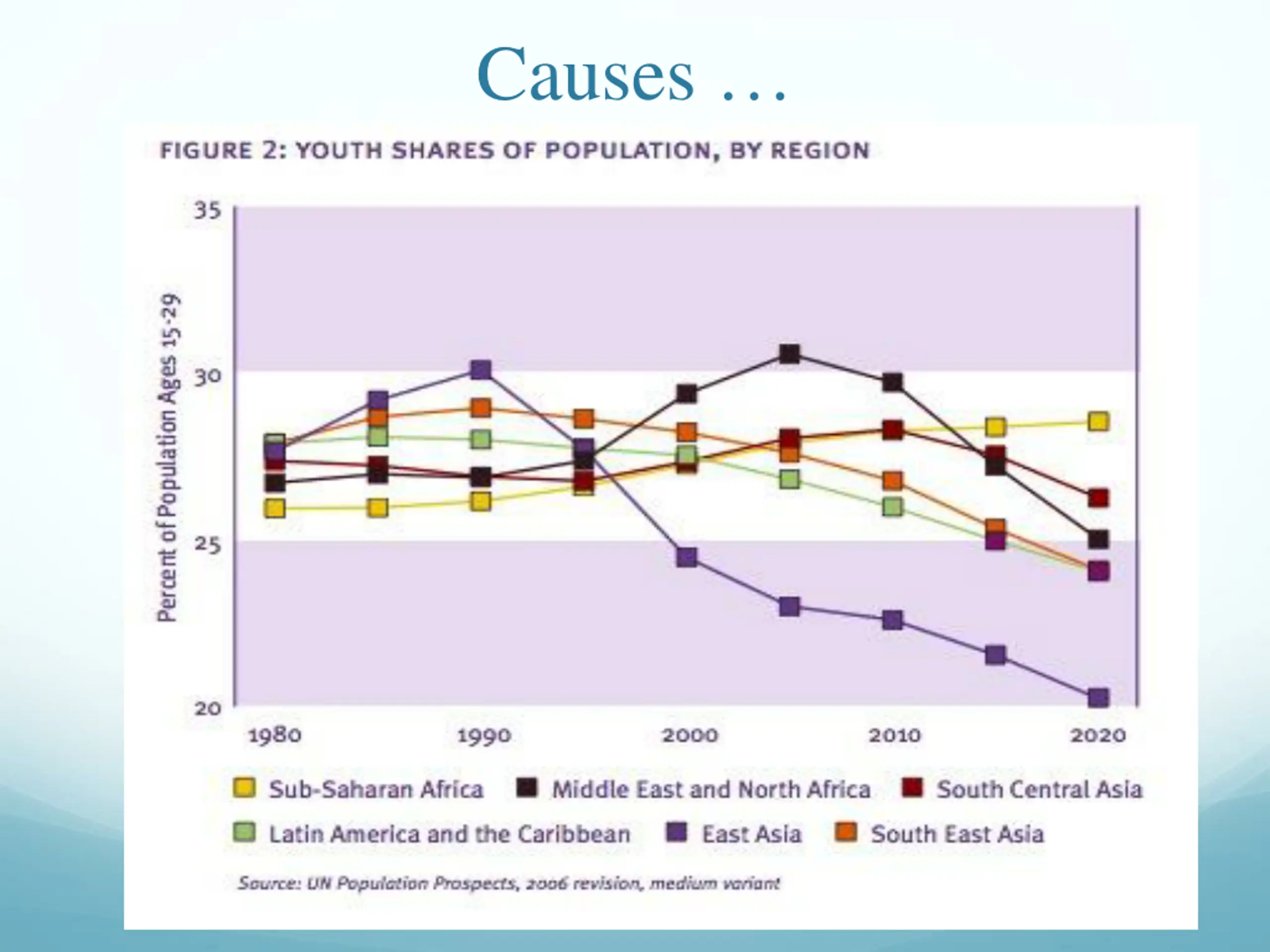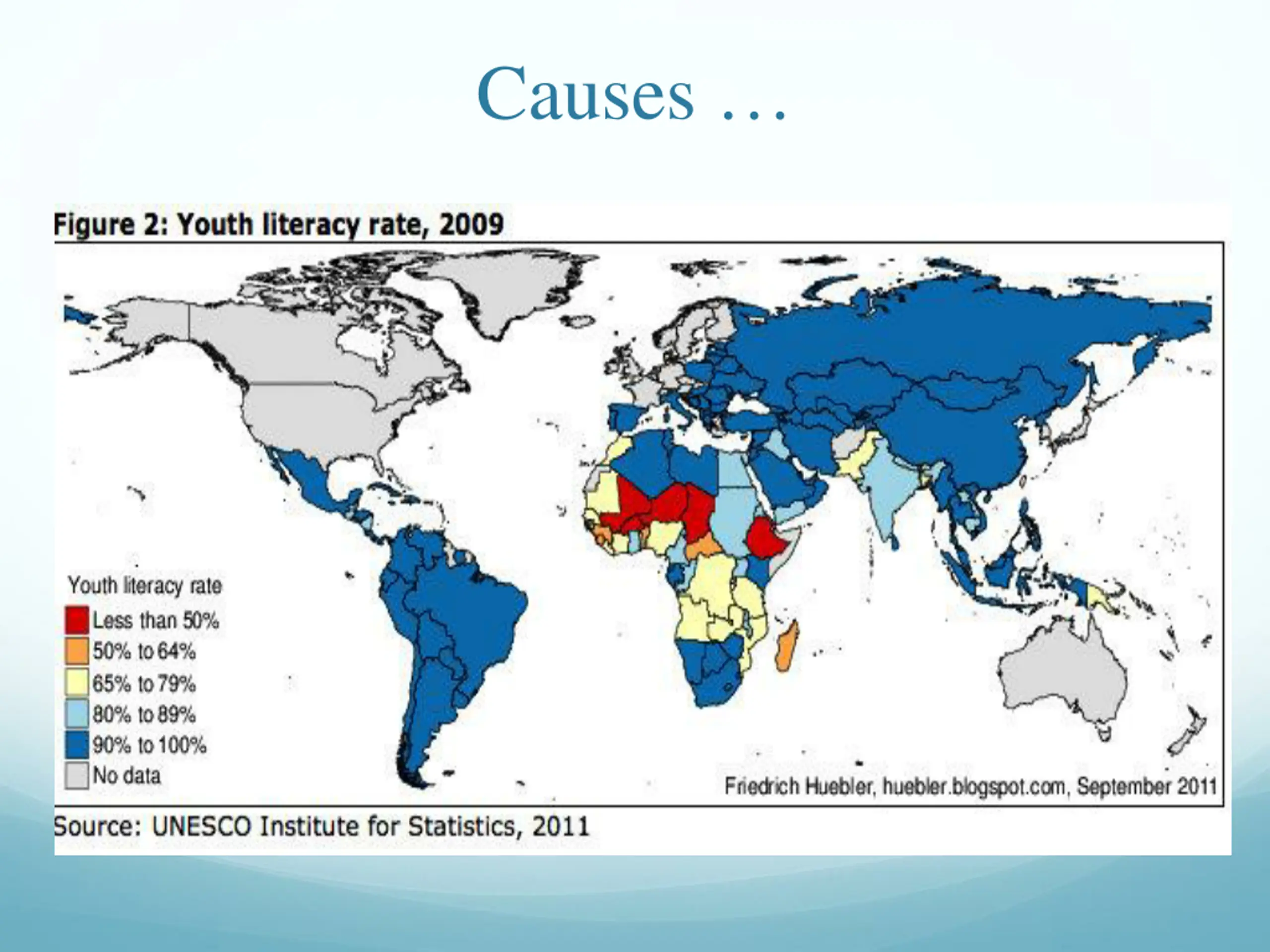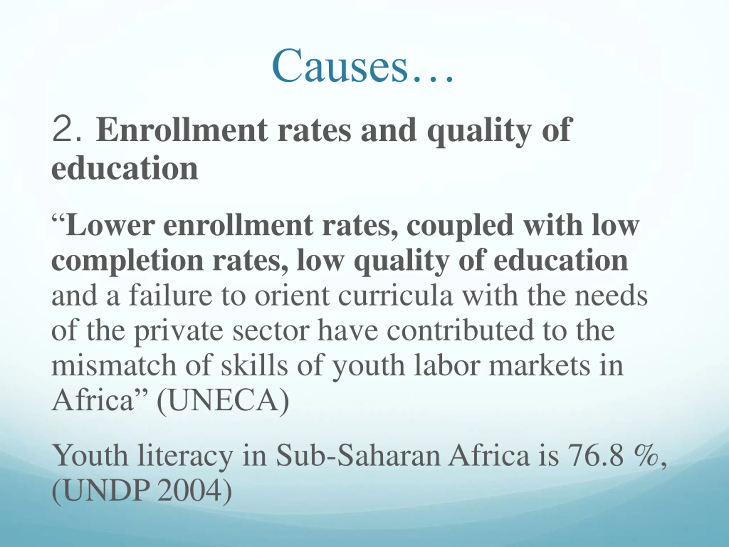 Causes 2. Enrollment rates and quality of education Lower enrollment rates, coupled with low completion rates, low quality of education and a failure to orient curricula with the needs of the private sector have contributed to the mismatch of skills of youth labor markets in Africa (UNECA) Youth literacy in Sub-Saharan Africa is 76.8 %, (UNDP 2004)