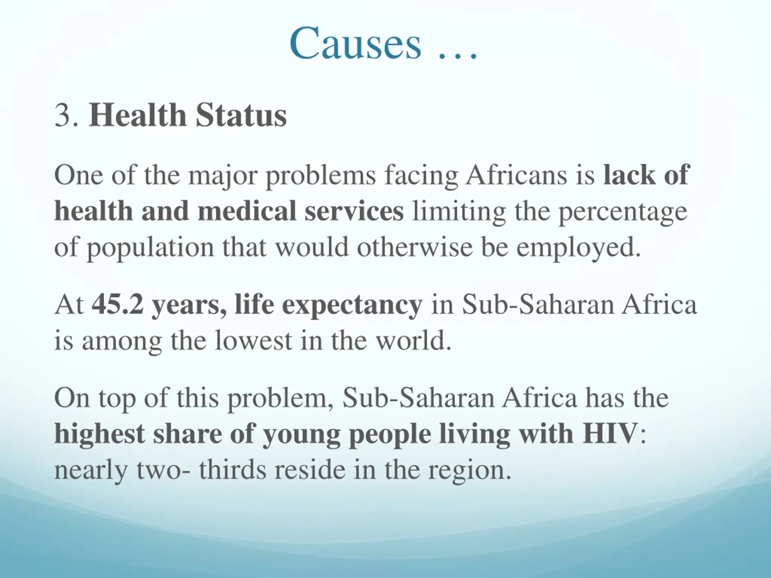 Causes 3. Health Status One of the major problems facing Africans is lack of health and medical services limiting the percentage of population that would otherwise be employed. At 45.2 years, life expectancy in Sub-Saharan Africa is among the lowest in the world. On top of this problem, Sub-Saharan Africa has the highest share of young people living with HIV: nearly two- thirds reside in the region.