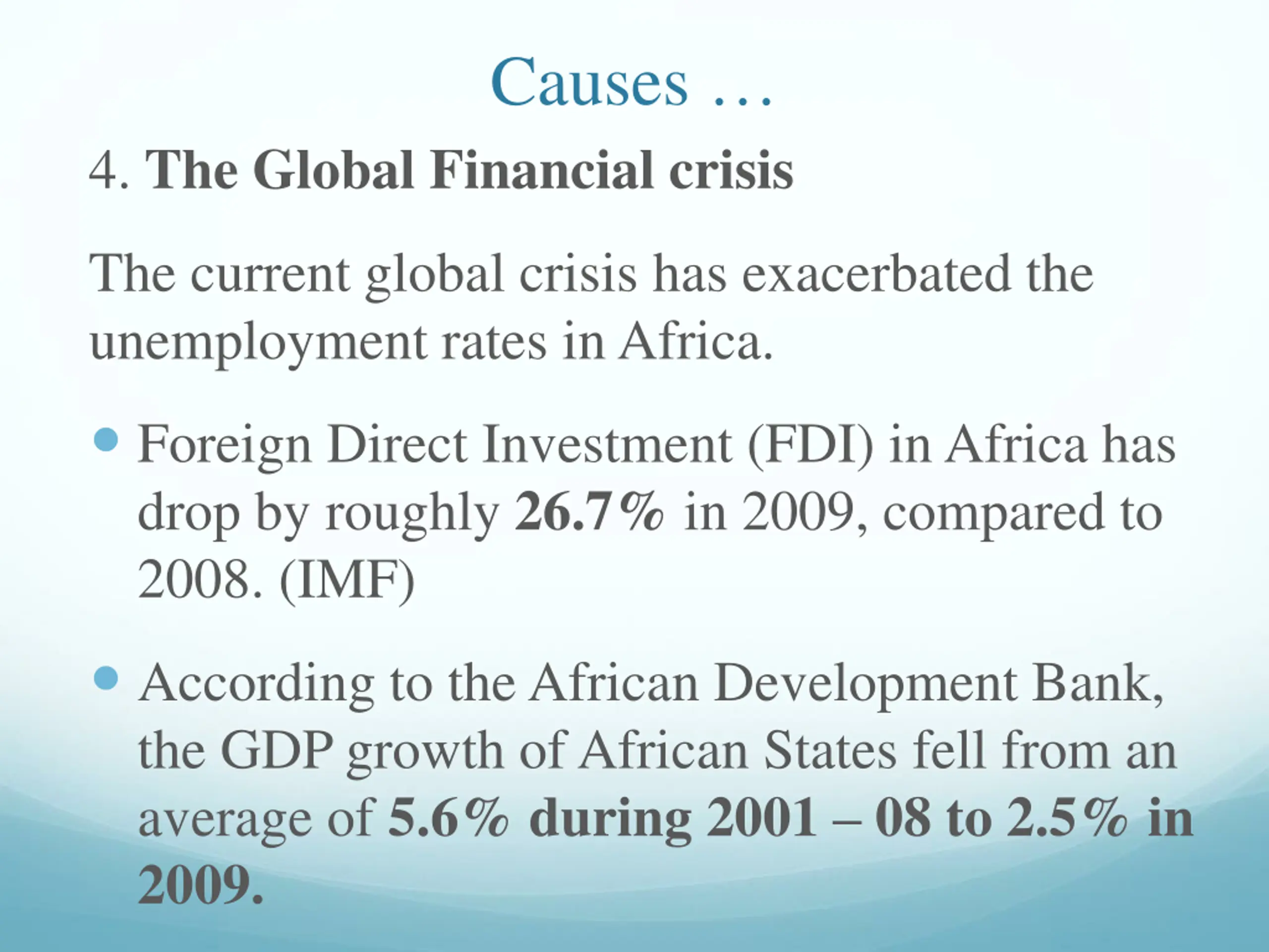 Causes 4. The Global Financial crisis The current global crisis has exacerbated the unemployment rates in Africa. Foreign Direct Investment (FDI) in Africa has drop by roughly 26.7% in 2009, compared to 2008. (IMF) According to the African Development Bank, the GDP growth of African States fell from an average of 5.6% during 2001 08 to 2.5% in 2009.