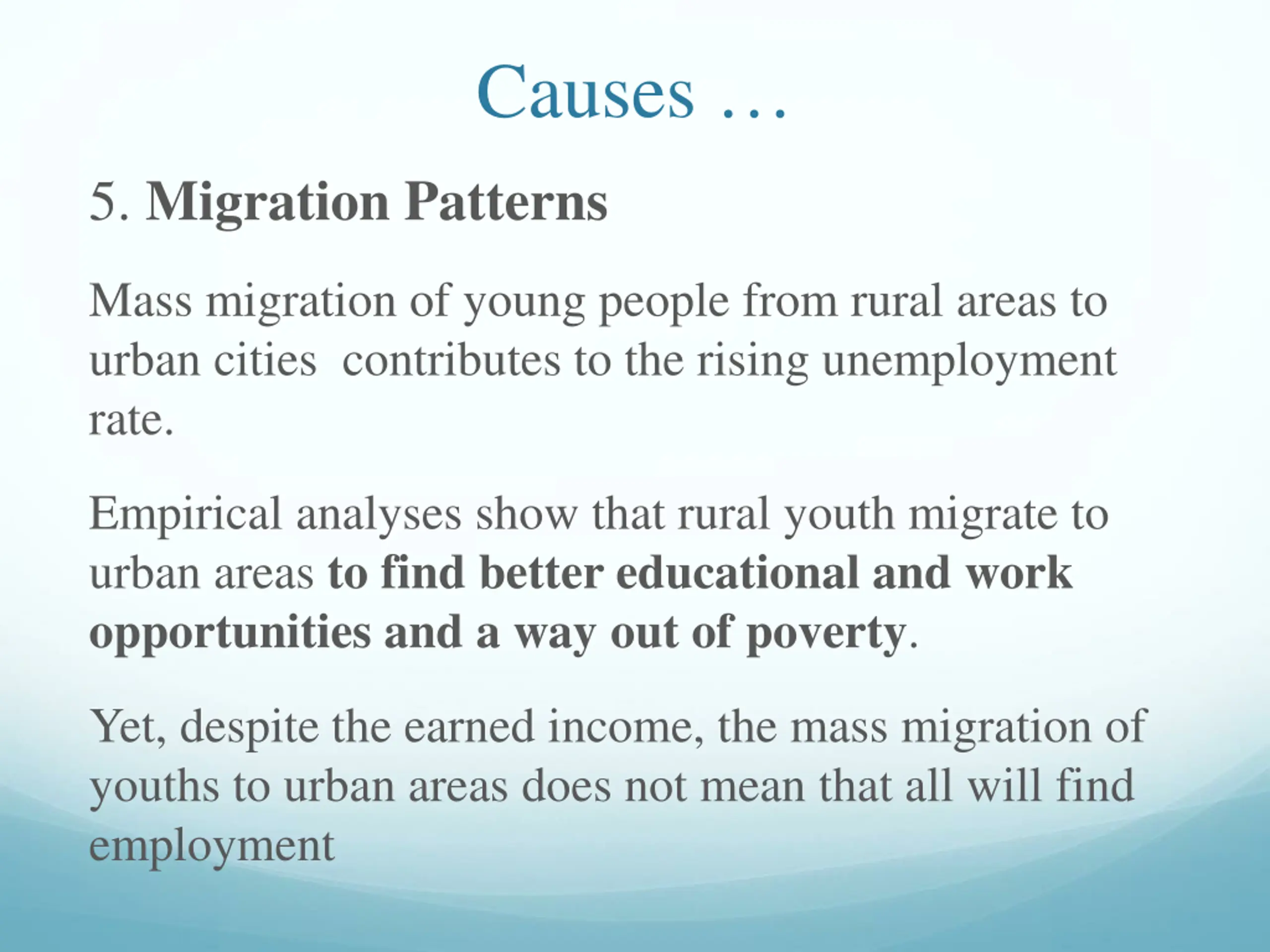 Causes 5. Migration Patterns Mass migration of young people from rural areas to urban cities contributes to the rising unemployment rate. Empirical analyses show that rural youth migrate to urban areas to find better educational and work opportunities and a way out of poverty. Yet, despite the earned income, the mass migration of youths to urban areas does not mean that all will find employment