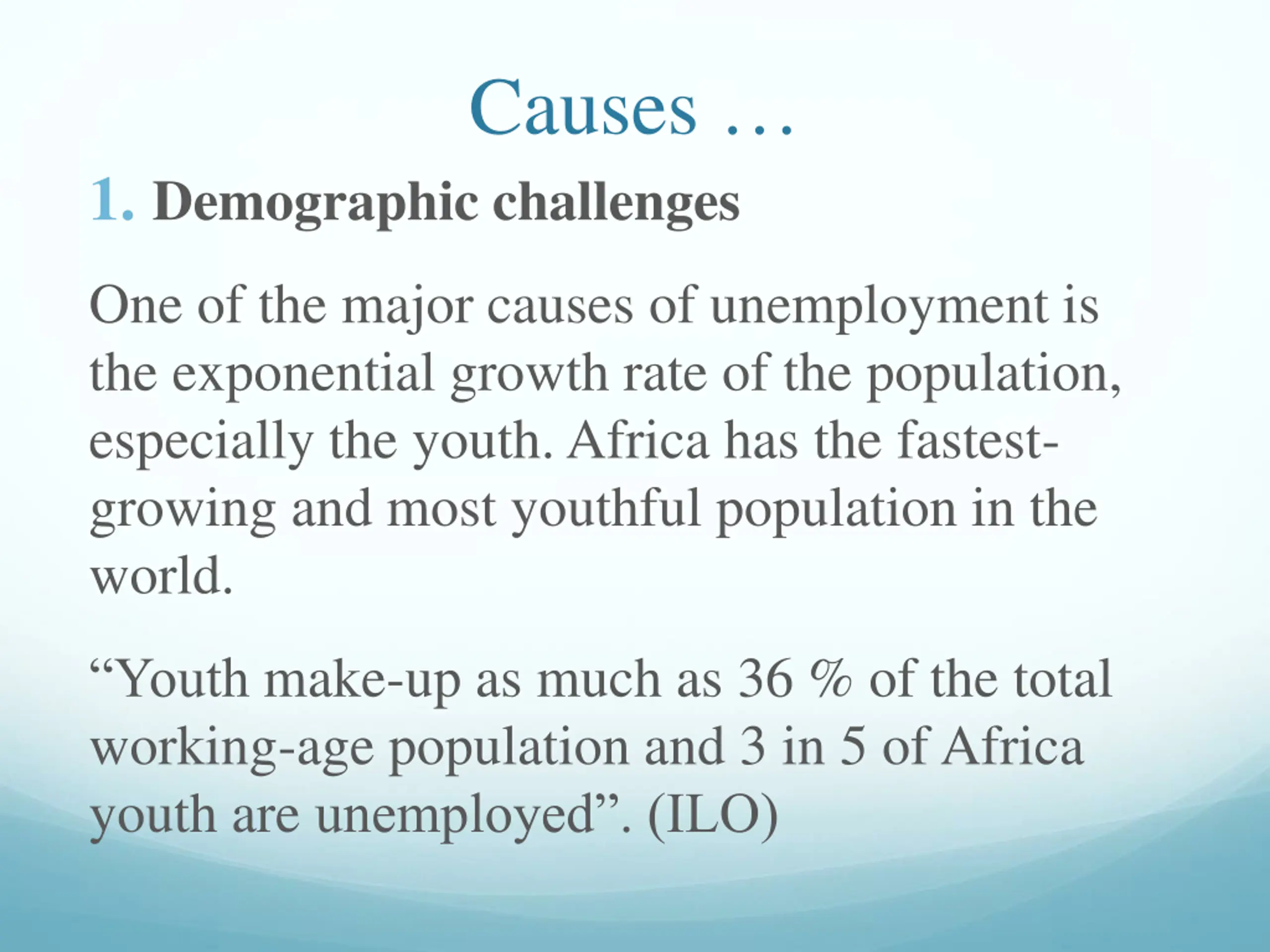Causes 1. Demographic challenges One of the major causes of unemployment is the exponential growth rate of the population, especially the youth. Africa has the fastest- growing and most youthful population in the world. Youth make-up as much as 36 % of the total working-age population and 3 in 5 of Africa youth are unemployed . (ILO)