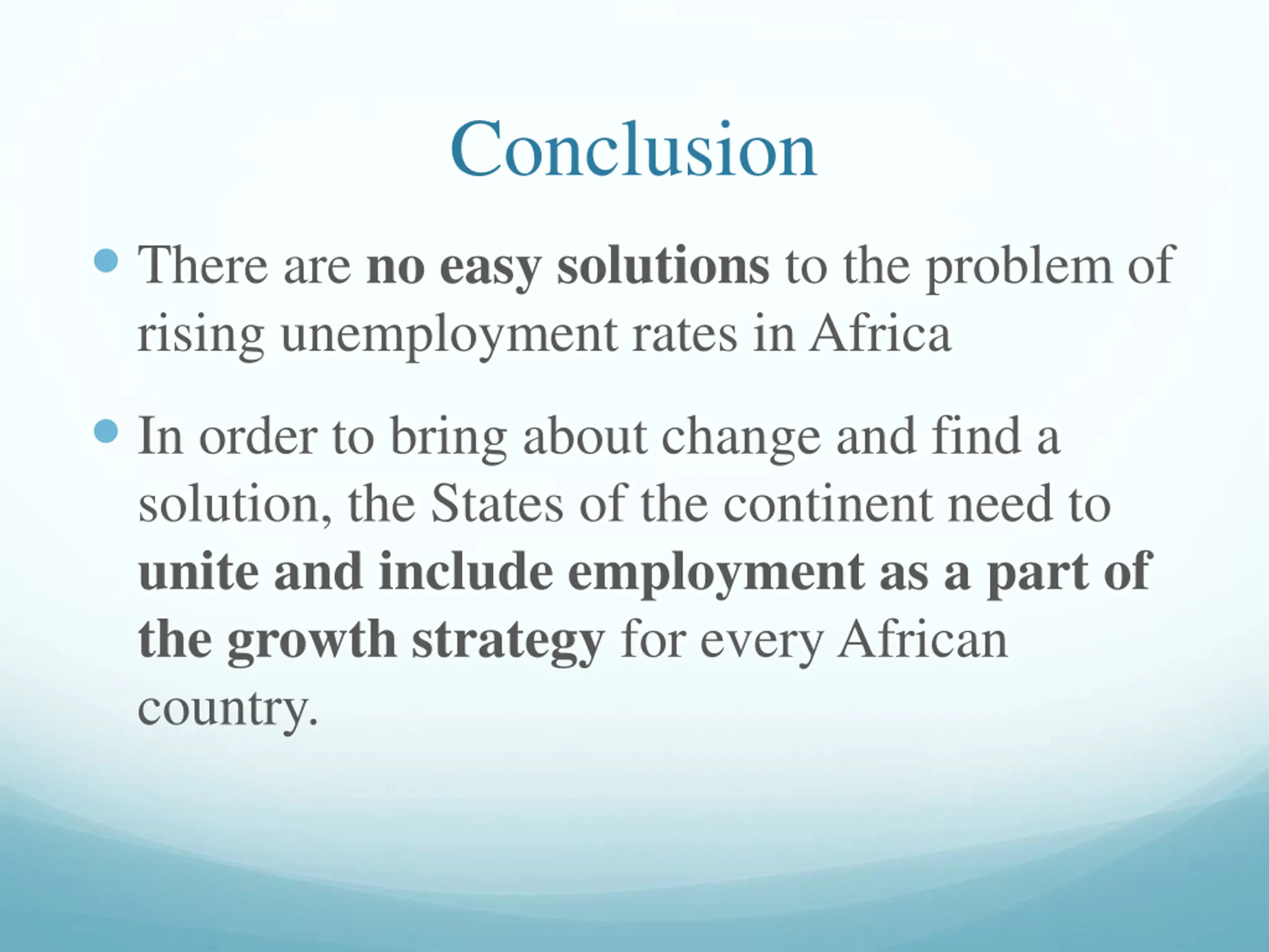 Conclusion There are no easy solutions to the problem of rising unemployment rates in Africa In order to bring about change and find a solution, the States of the continent need to unite and include employment as a part of the growth strategy for every African country.