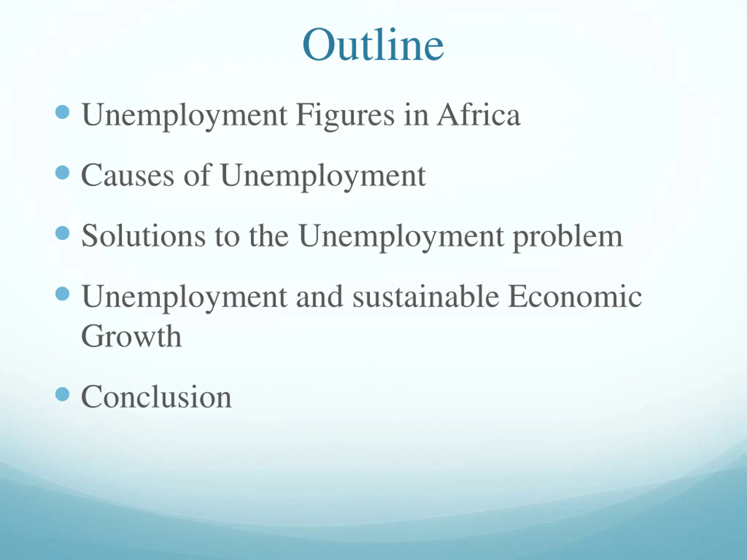 Outline Unemployment Figures in Africa Causes of Unemployment Solutions to the Unemployment problem Unemployment and sustainable Economic Growth Conclusion