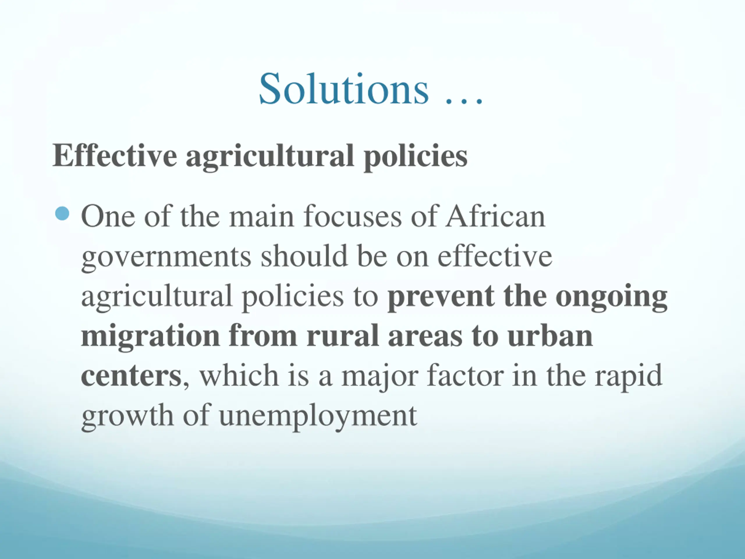 Solutions Effective agricultural policies One of the main focuses of African governments should be on effective agricultural policies to prevent the ongoing migration from rural areas to urban centers, which is a major factor in the rapid growth of unemployment