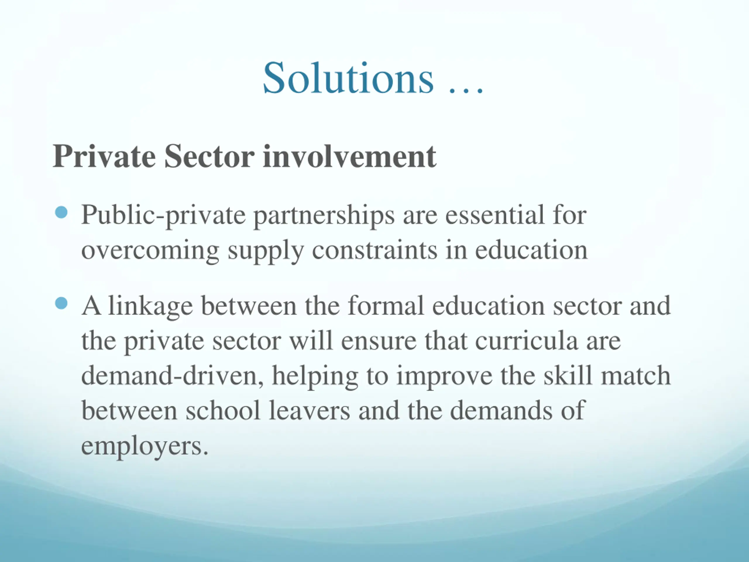 Solutions Private Sector involvement Public-private partnerships are essential for overcoming supply constraints in education A linkage between the formal education sector and the private sector will ensure that curricula are demand-driven, helping to improve the skill match between school leavers and the demands of employers.
