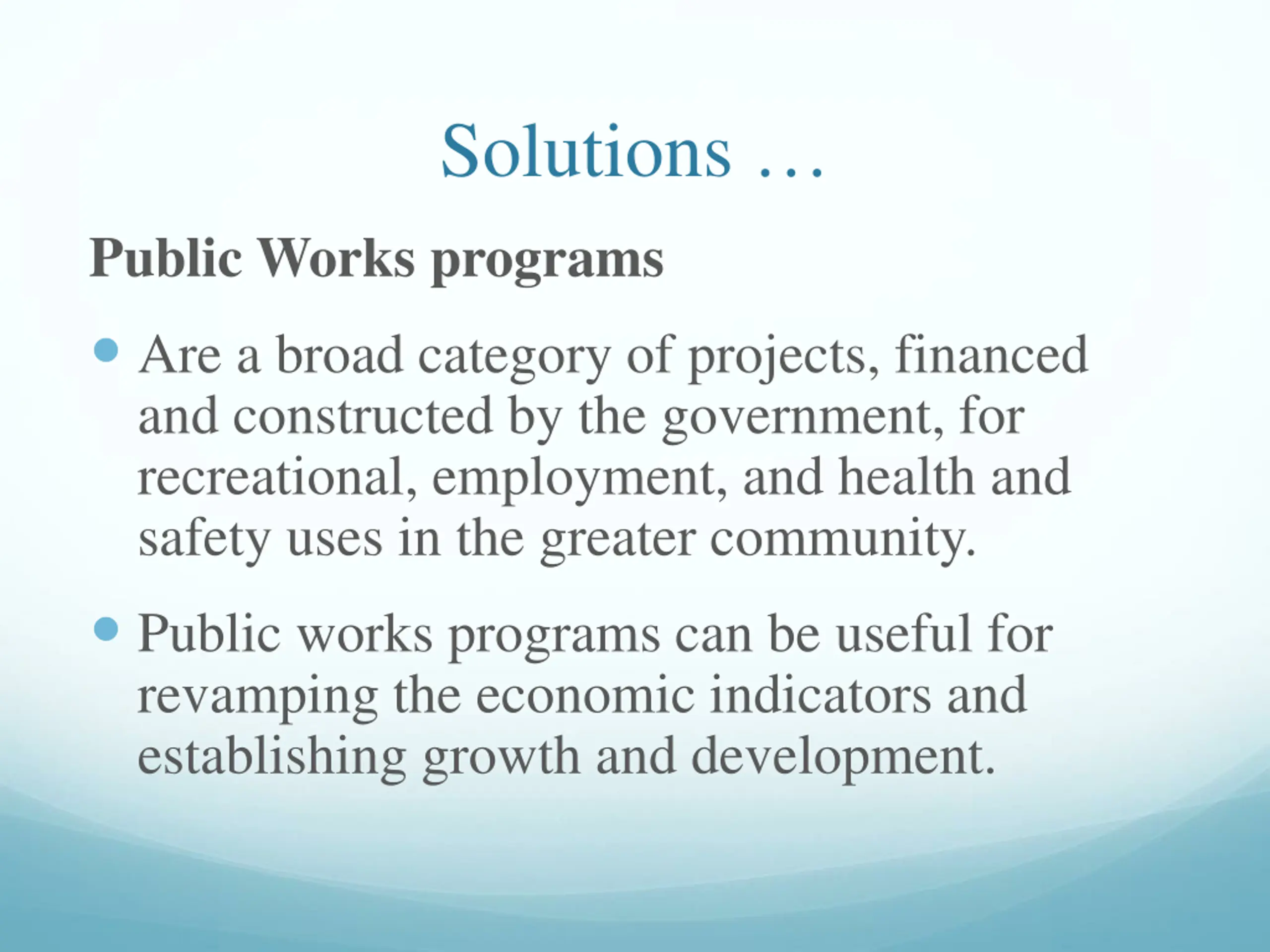 Solutions Public Works programs Are a broad category of projects, financed and constructed by the government, for recreational, employment, and health and safety uses in the greater community. Public works programs can be useful for revamping the economic indicators and establishing growth and development.