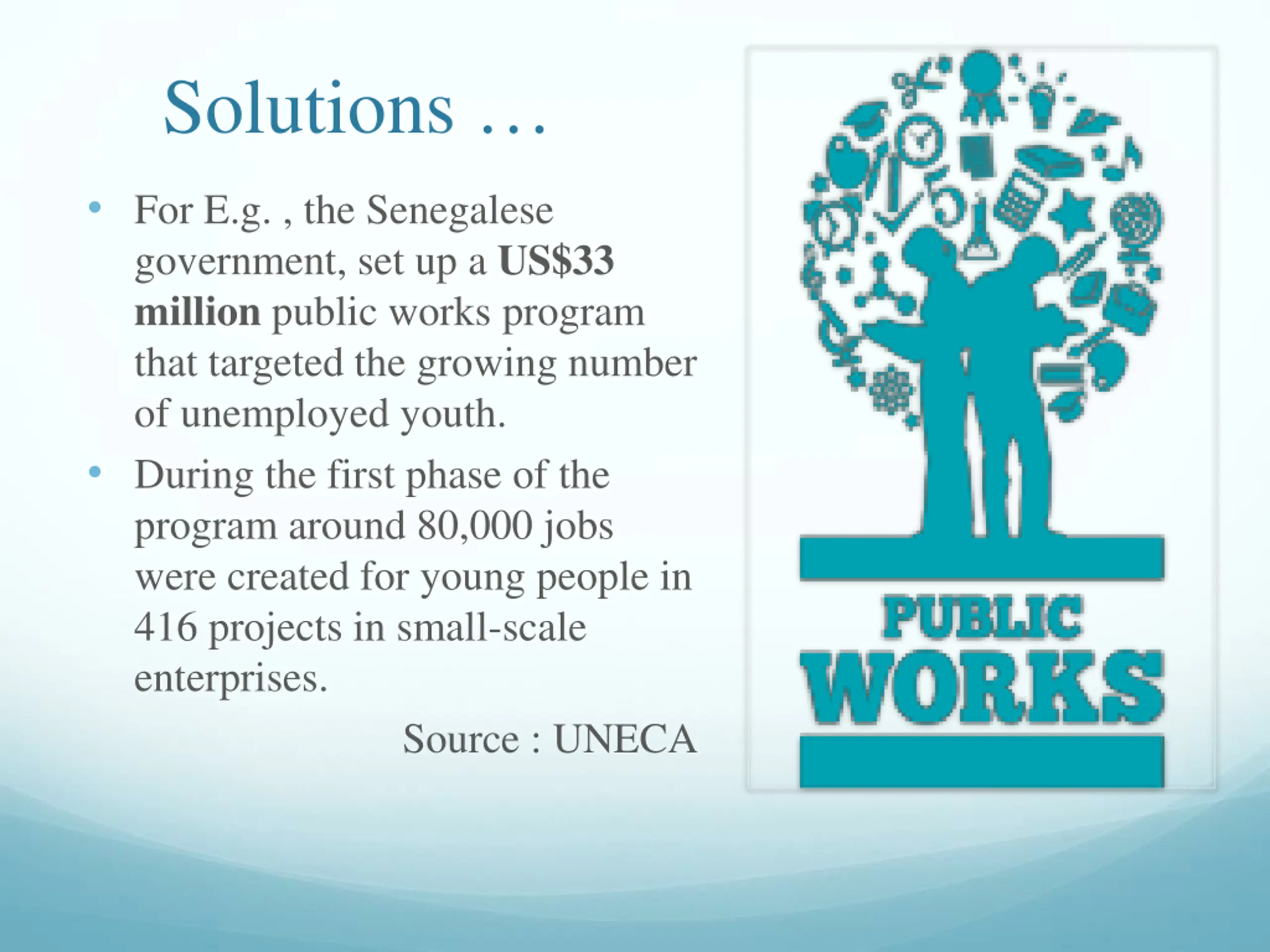 Solutions For E.g. , the Senegalese government, set up a US$33 million public works program that targeted the growing number of unemployed youth. During the first phase of the program around 80,000 jobs were created for young people in 416 projects in small-scale enterprises. Source : UNECA