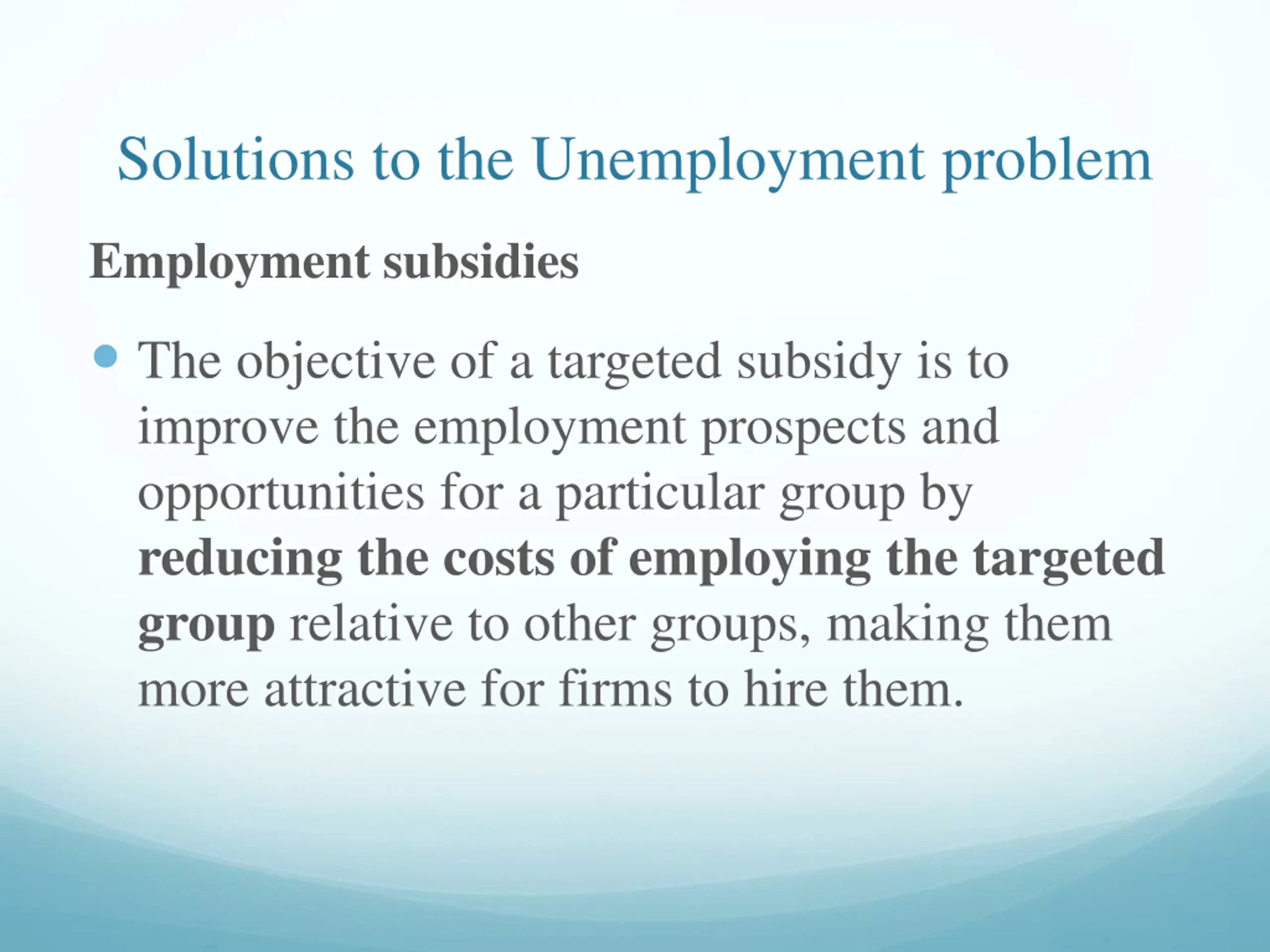 Solutions to the Unemployment problem Employment subsidies The objective of a targeted subsidy is to improve the employment prospects and opportunities for a particular group by reducing the costs of employing the targeted group relative to other groups, making them more attractive for firms to hire them.