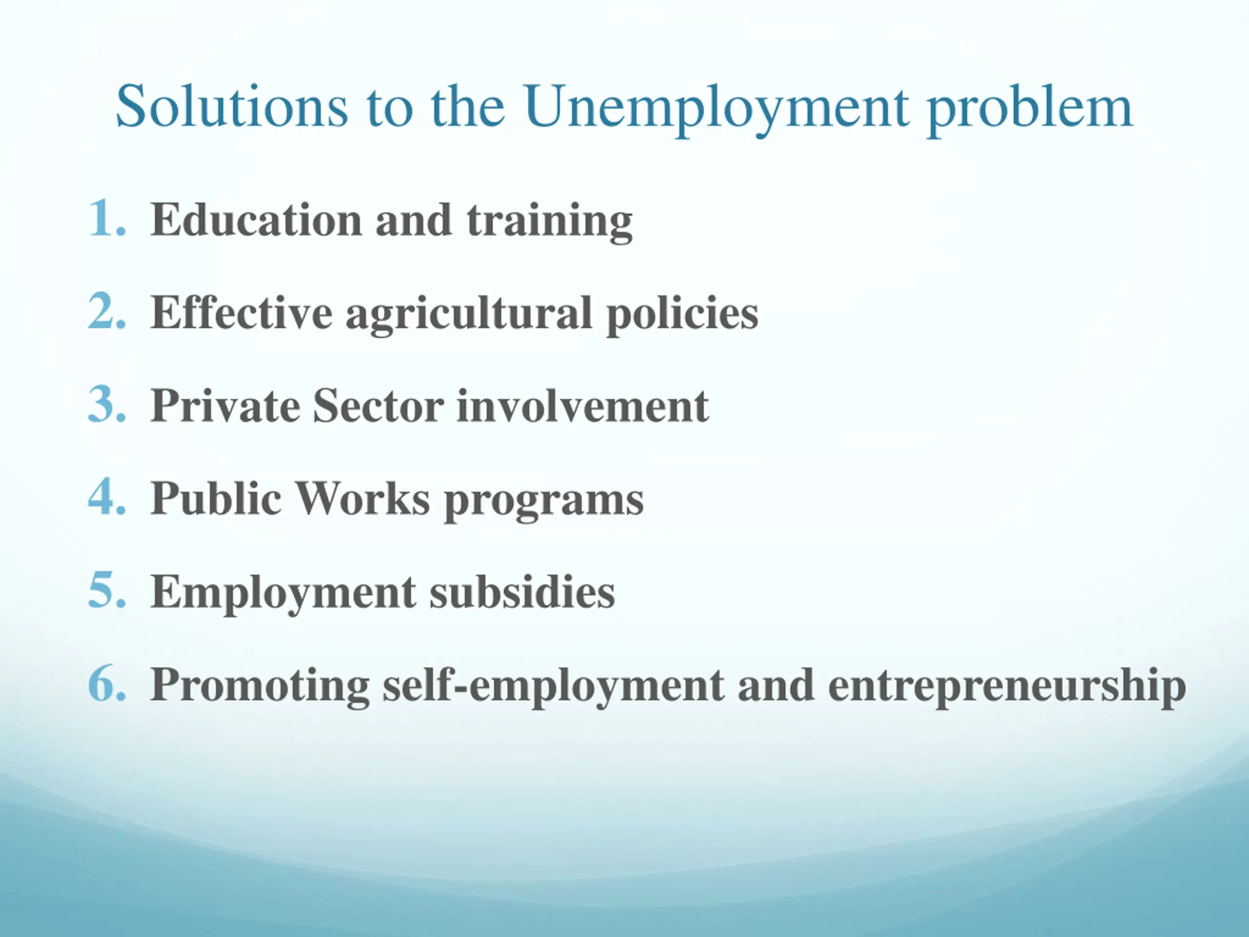 Solutions to the Unemployment problem 1. Education and training 2. Effective agricultural policies 3. Private Sector involvement 4. Public Works programs 5. Employment subsidies 6. Promoting self-employment and entrepreneurship