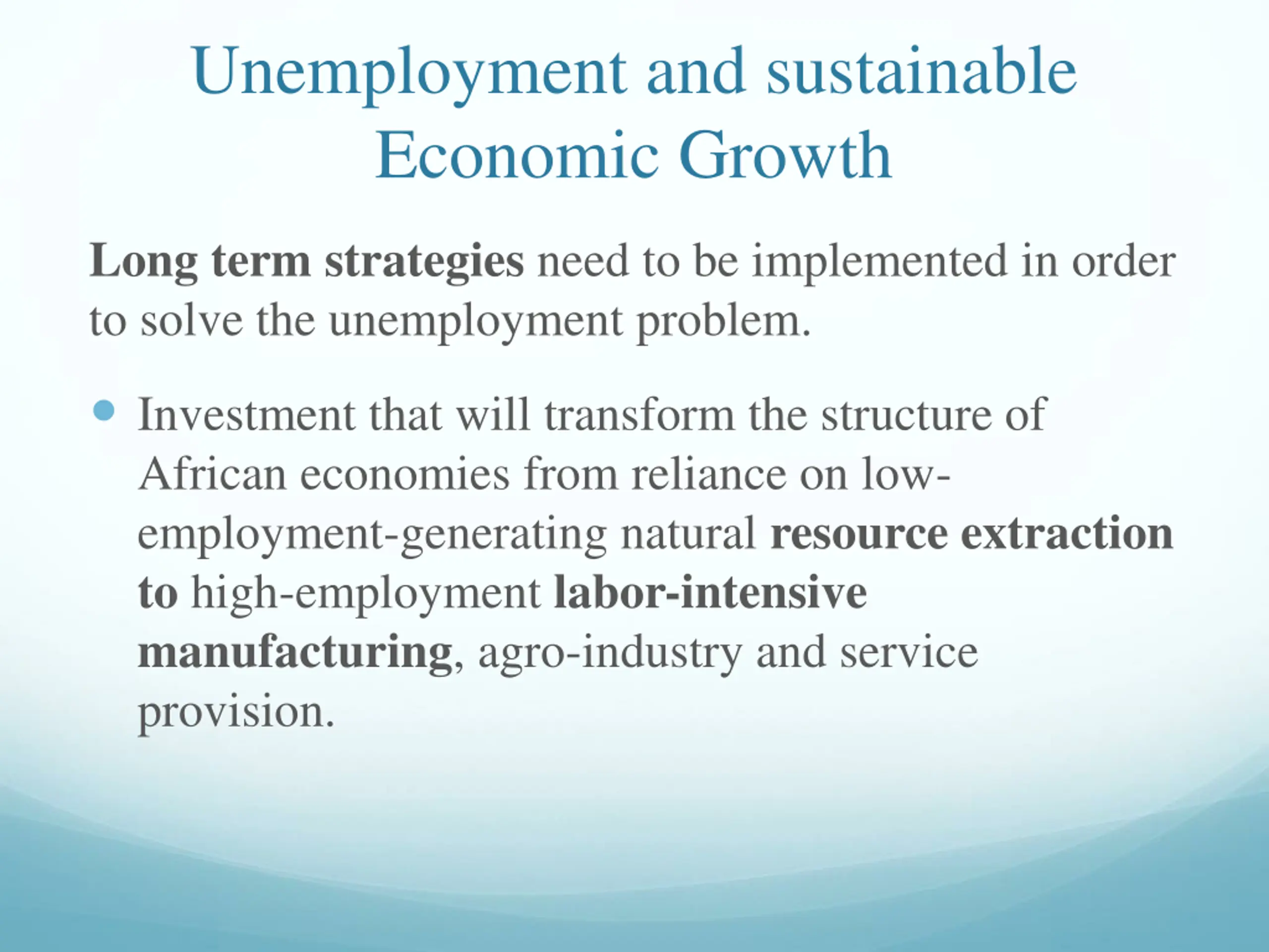 Unemployment and sustainable Economic Growth Long term strategies need to be implemented in order to solve the unemployment problem. Investment that will transform the structure of African economies from reliance on low- employment-generating natural resource extraction to high-employment labor-intensive manufacturing, agro-industry and service provision.