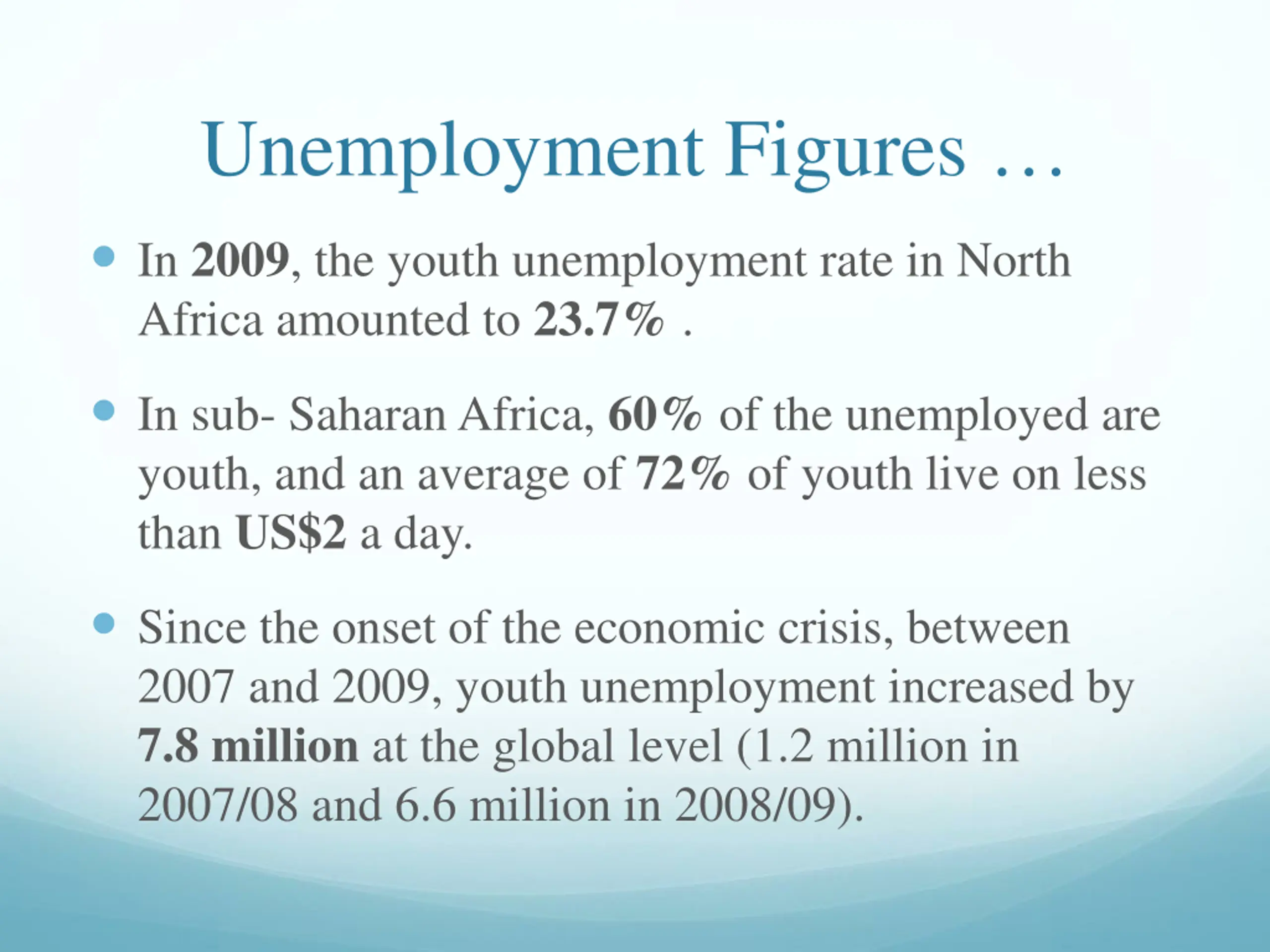 Unemployment Figures In 2009, the youth unemployment rate in North Africa amounted to 23.7% . In sub- Saharan Africa, 60% of the unemployed are youth, and an average of 72% of youth live on less than US$2 a day. Since the onset of the economic crisis, between 2007 and 2009, youth unemployment increased by 7.8 million at the global level (1.2 million in 2007/08 and 6.6 million in 2008/09).