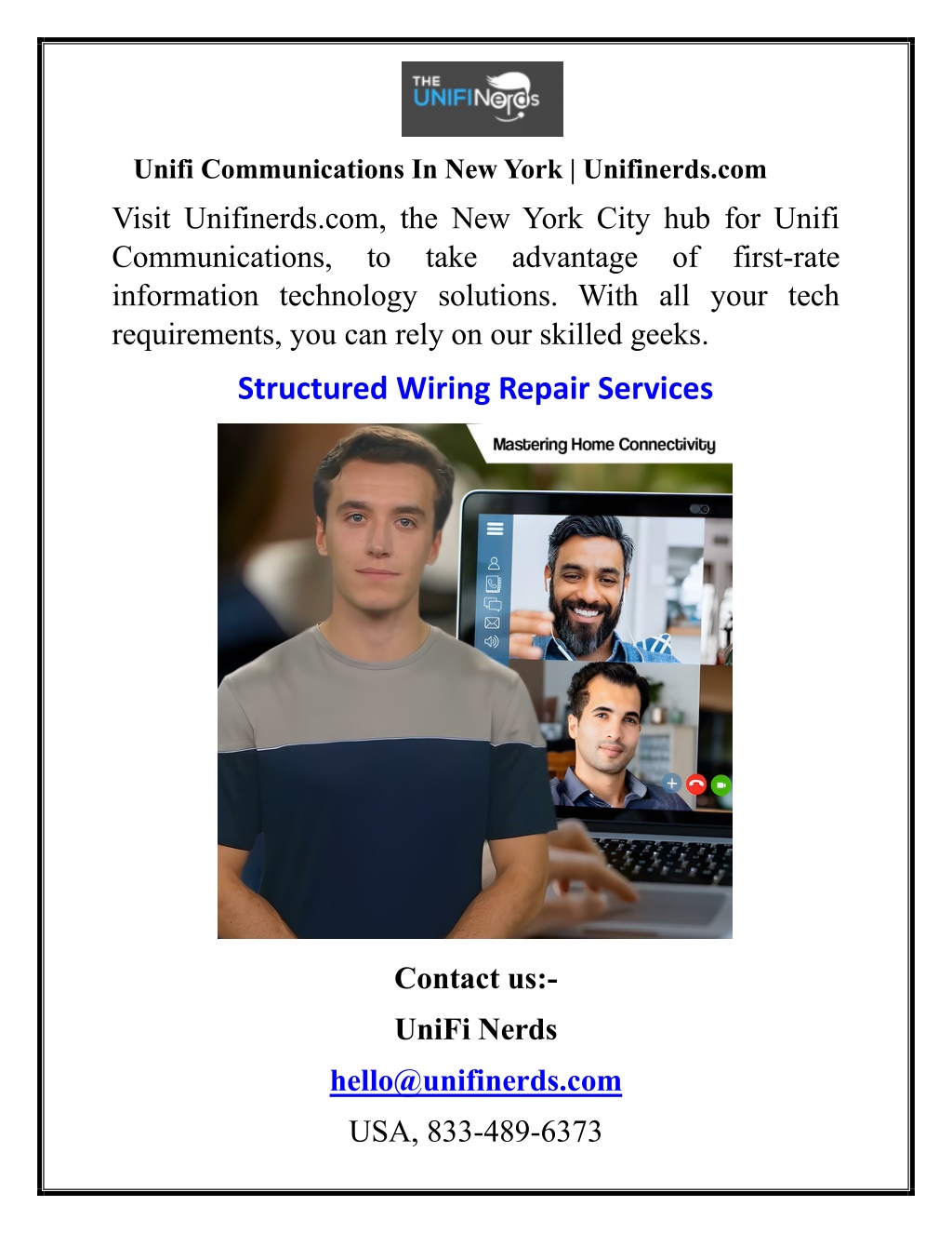 Unifi Communications In New York | Unifinerds.com Visit Unifinerds.com, the New York City hub for Unifi Communications, to take advantage of first-rate information technology solutions. With all your tech requirements, you can rely on our skilled geeks. Structured Wiring Repair Services Contact us:- UniFi Nerds hello@unifinerds.com USA, 833-489-6373