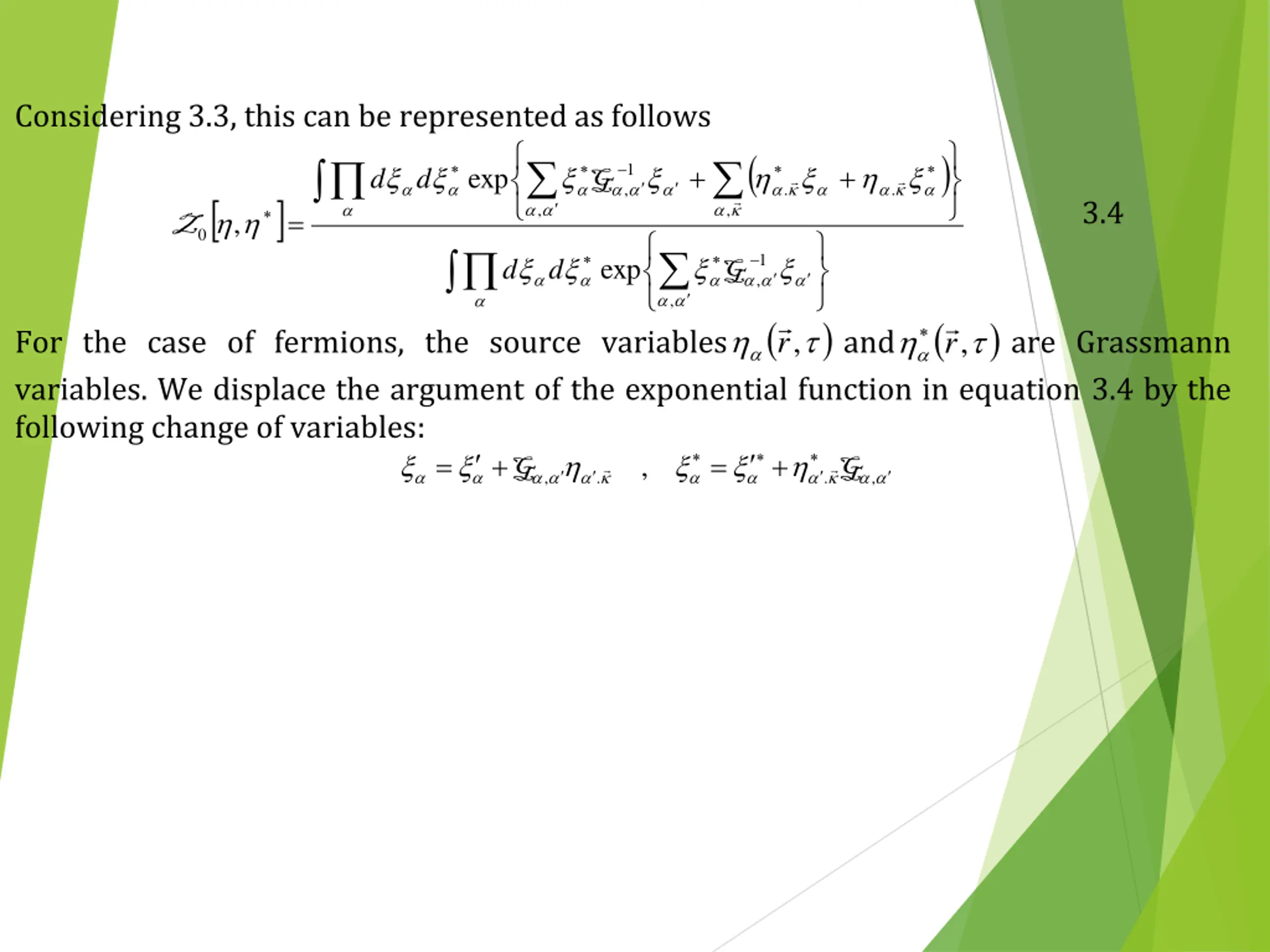 Considering 3.3, this can be represented as follows = 0 , Z ( ) , , d d + + 1 exp G , . . 3.4 , d d 1 exp G , ) , r , r ( ( ) For the case of fermions, the source variables variables. We displace the argument of the exponential function in equation 3.4 by the following change of variables: + = . , G and are Grassmann = + , G . ,