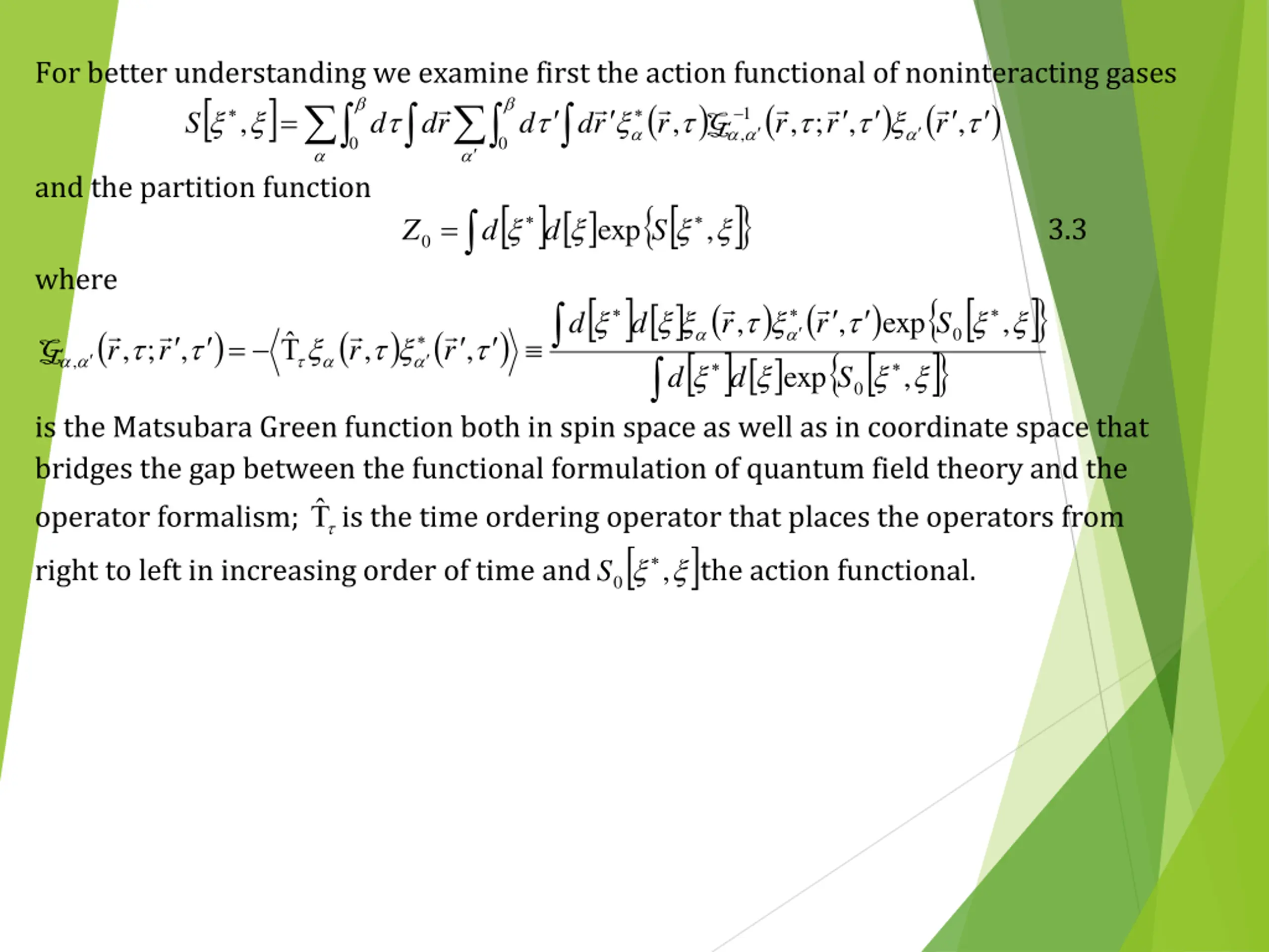 For better understanding we examine first the action functional of noninteracting gases and the partition function where ( , , , ; , , = r r r r G ( ) ( ) ( ) , = , , , , 1 ; S d r d d r d r r r r G , 0 0 = , 3.3 exp Z d d S 0 ) ( ) , , , exp d d r r S ( ) ( ) ( ) exp 0 d , d S 0 is the Matsubara Green function both in spin space as well as in coordinate space that bridges the gap between the functional formulation of quantum field theory and the operator formalism; right to left in increasing order of time and is the time ordering operator that places the operators from , 0 S the action functional.