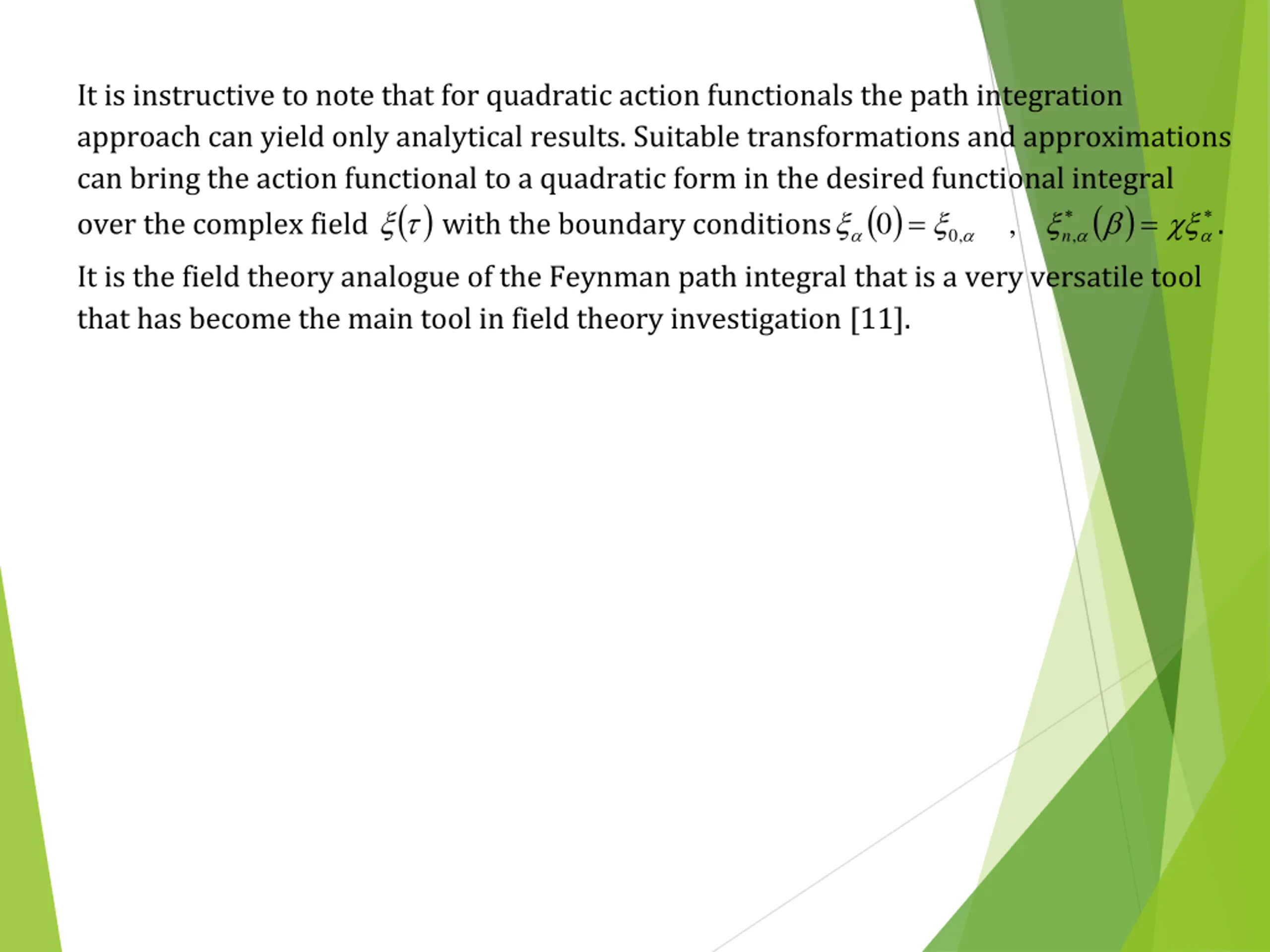It is instructive to note that for quadratic action functionals the path integration approach can yield only analytical results. Suitable transformations and approximations can bring the action functional to a quadratic form in the desired functional integral over the complex field ( ) with the boundary conditions It is the field theory analogue of the Feynman path integral that is a very versatile tool that has become the main tool in field theory investigation [11]. ( ) 0 ( ) , n = = . , , 0