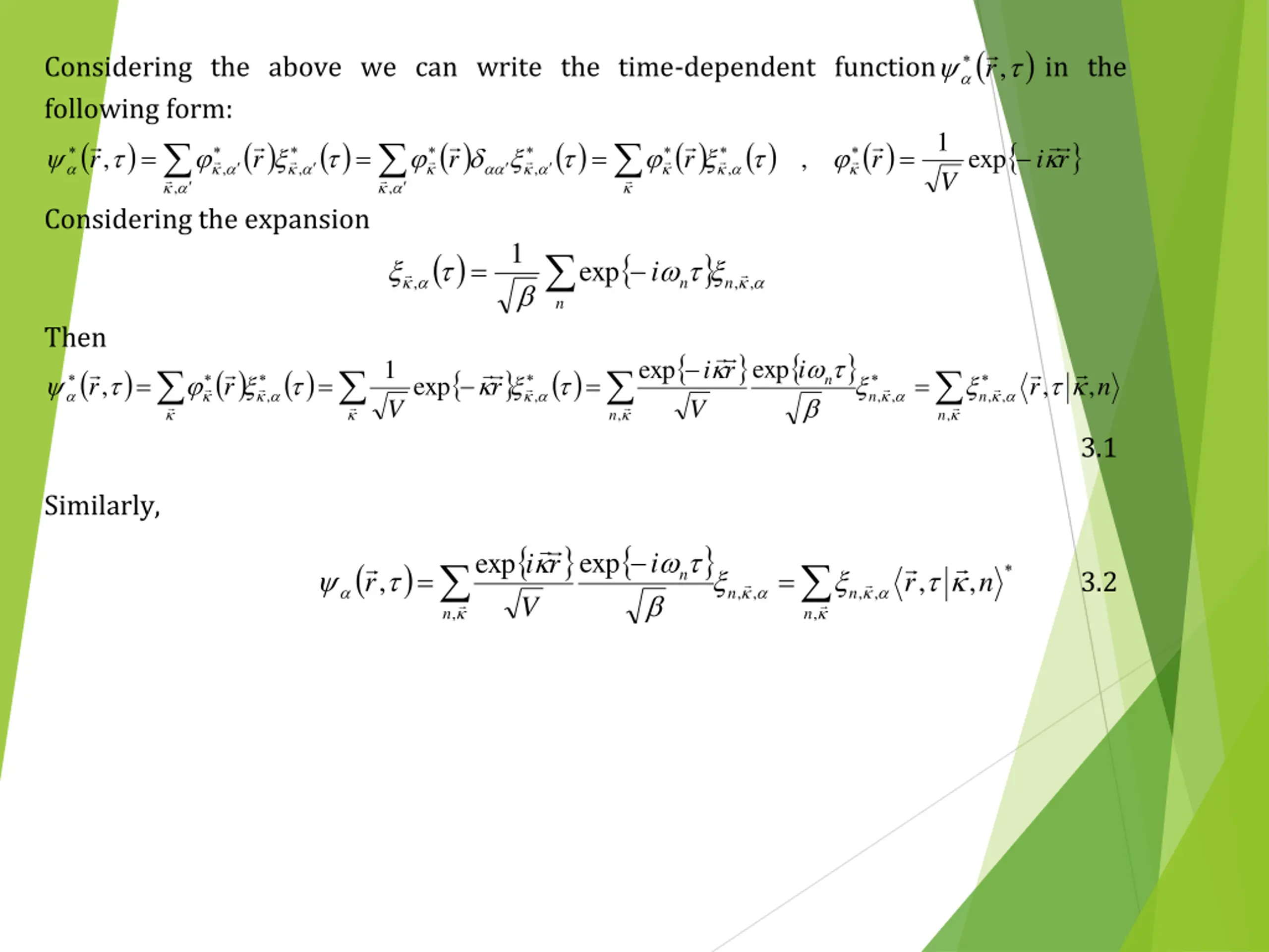 3.MATSUBARA EXPANSION We consider a particle located in the volume V and described by the Schrodinger equation: = = , Here, is the energy eigen value and the eigen function: ( ) ( ) ( ) r r r , , and , 1 ( ) r ( ) r = = = = , exp i r , , , , V 1 ( ) r = exp r d i r , V Similarly ( ) r ( ) = r ,