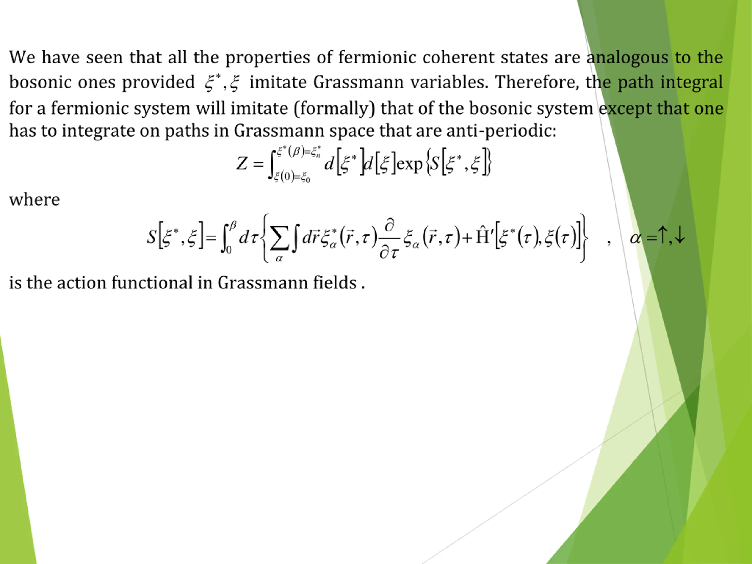 We have seen that all the properties of fermionic coherent states are analogous to the bosonic ones provided , imitate Grassmann variables. Therefore, the path integral for a fermionic system will imitate (formally) that of the bosonic system except that one has to integrate on paths in Grassmann space that are anti-periodic: ( ) = 0 0 where ( is the action functional in Grassmann fields . ( ) n = = , exp Z d d S ) ( ) ( ) ( ) , = d + = , , , , , S r d r r 0