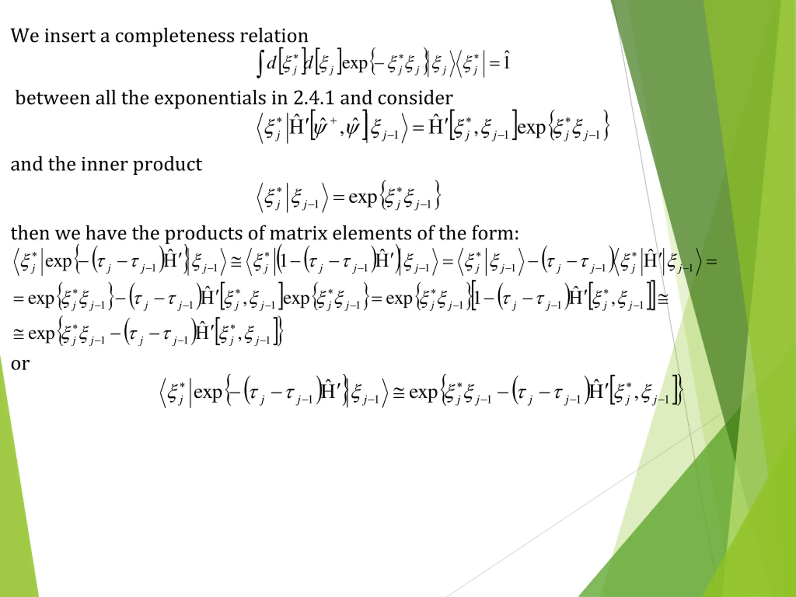 We insert a completeness relation 1 jd j j = exp d j j j between all the exponentials in 2.4.1 and consider j + j j , = , exp 1 1 1 j j j and the inner product j j = exp 1 1 j j then we have the products of matrix elements of the form: ( ( 1 1 1 , exp j j j j j j or ( exp j j ( ) ) ( ) ( ) j j j j = = exp 1 1 1 1 1 1 1 1 j j j j j j j j j j 1 ) ) ) ( ( j j j j j = = exp , exp exp , 1 1 1 1 1 1 1 j j j j j j j j j ) ) ( j j exp , 1 1 1 1 1 j j j j j j