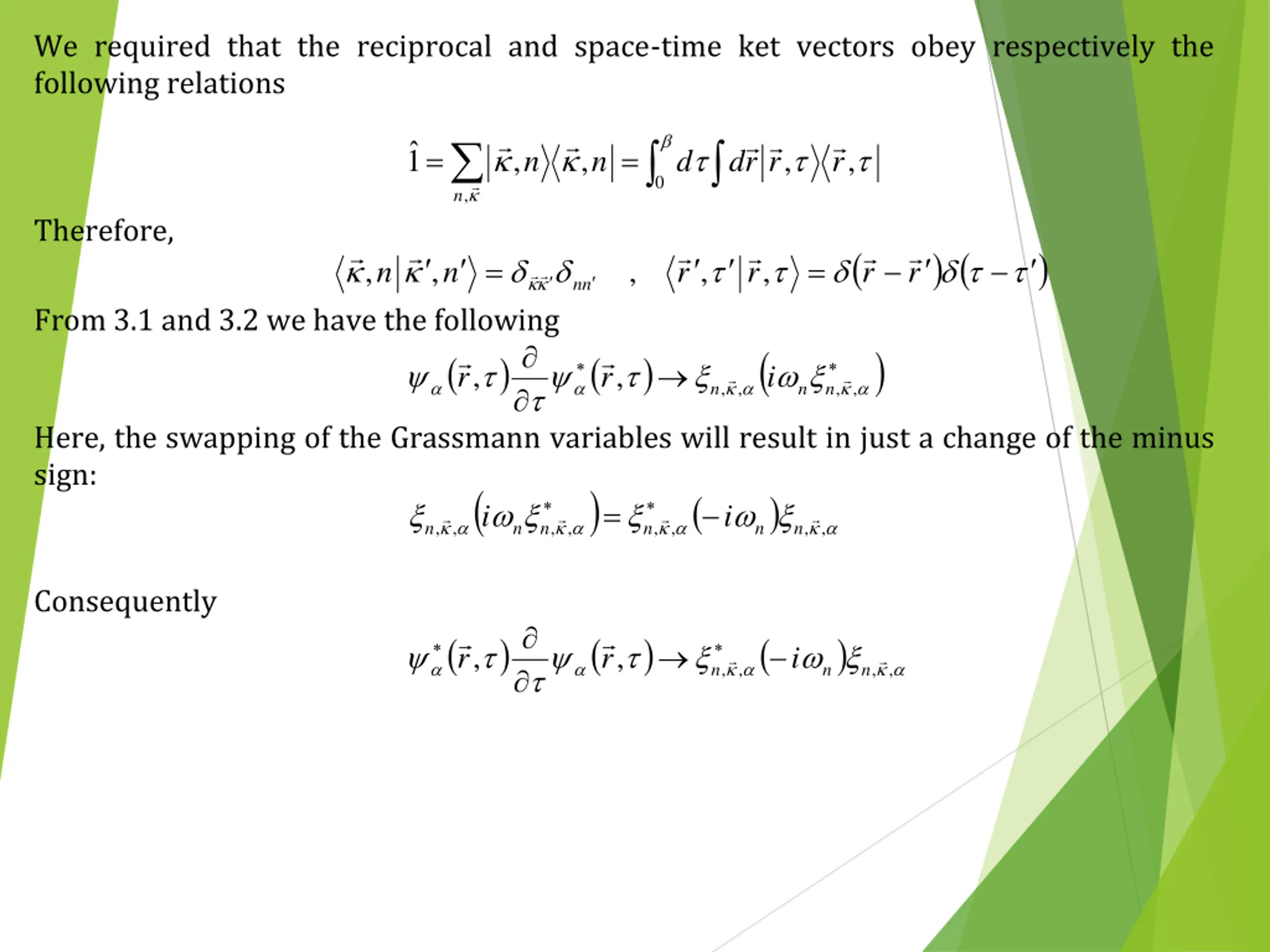We required that the reciprocal and space-time ket vectors obey respectively the following relations r r , n 1 = = , , , , n n d r d 0 Therefore, ( ) ( ) = , , = , , , n n r r r r n n From 3.1 and 3.2 we have the following ( ) r r ( ) ( ) n , , i n , , , , n Here, the swapping of the Grassmann variables will result in just a change of the minus sign: ( , , , , n n n i = Consequently ( ) ( ) ( ) i , , , , n n n r r ) ( ) , i , , , , , n n n