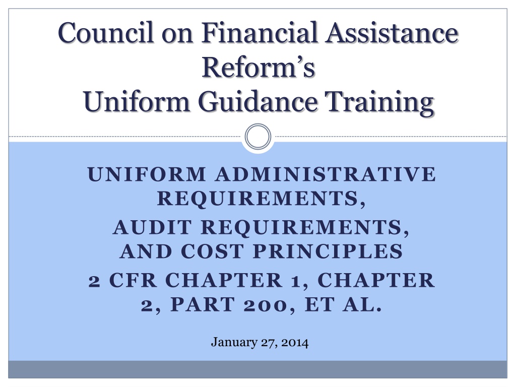 Council on Financial Assistance Reform s Uniform Guidance Training UNIFORM ADMINISTRATIVE REQUIREMENTS, AUDIT REQUIREMENTS, AND COST PRINCIPLES 2 CFR CHAPTER 1, CHAPTER 2, PART 200, ET AL. January 27, 2014