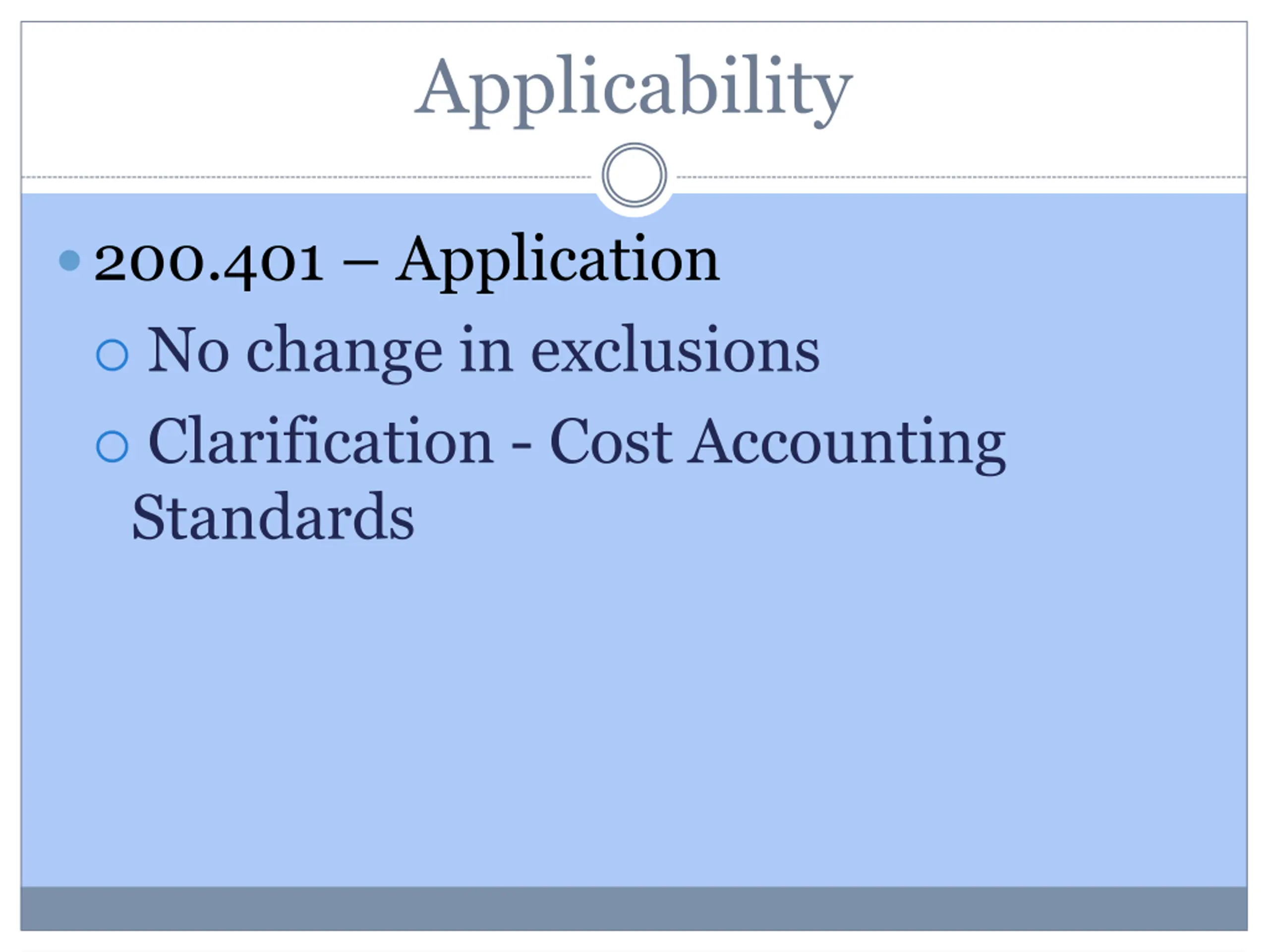 Applicability 200.401 Application No change in exclusions Clarification - Cost Accounting Standards