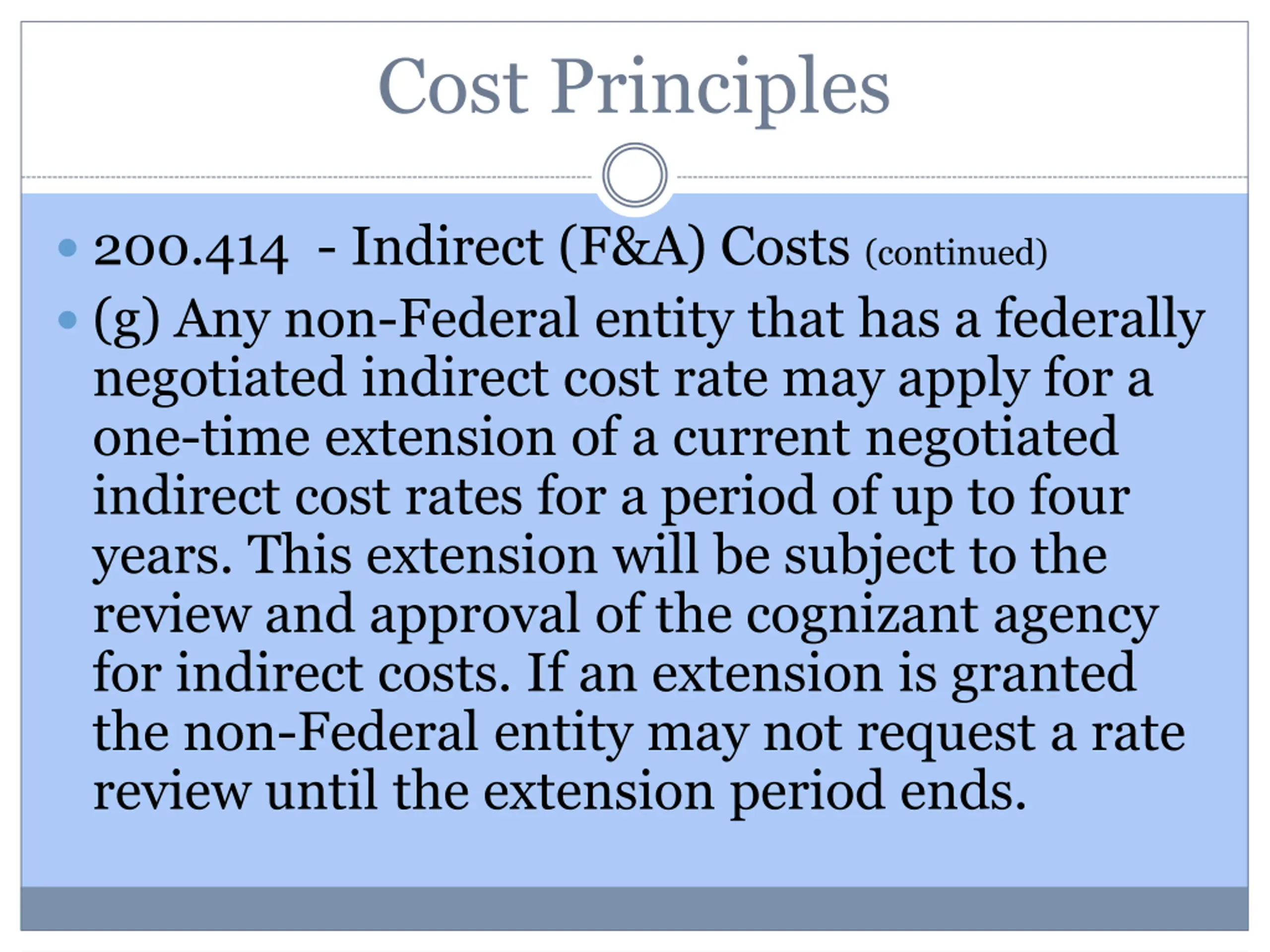 Cost Principles 200.414 - Indirect (F&A) Costs (continued) (g) Any non-Federal entity that has a federally negotiated indirect cost rate may apply for a one-time extension of a current negotiated indirect cost rates for a period of up to four years. This extension will be subject to the review and approval of the cognizant agency for indirect costs. If an extension is granted the non-Federal entity may not request a rate review until the extension period ends.