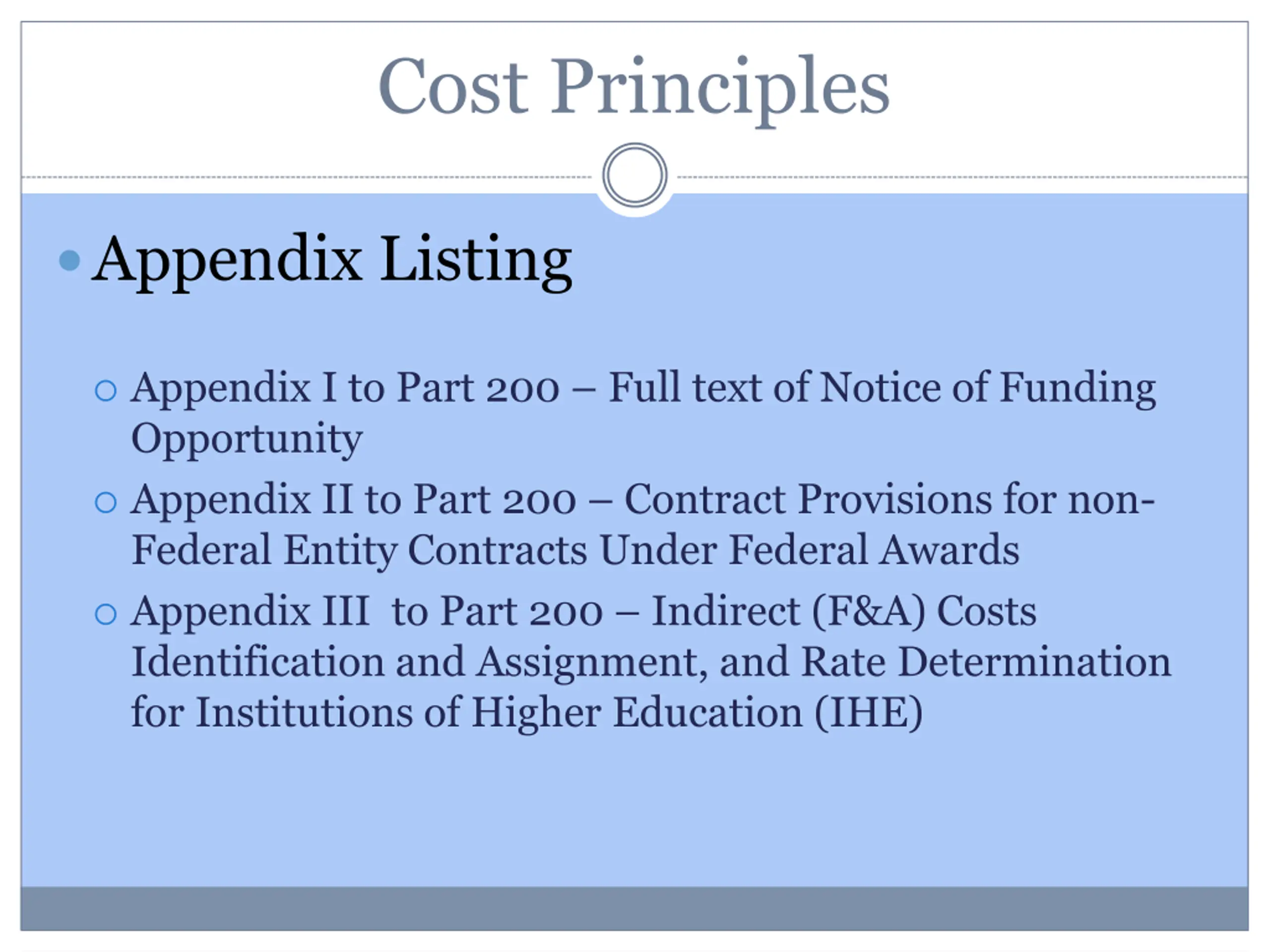 Cost Principles Appendix Listing Appendix I to Part 200 Full text of Notice of Funding Opportunity Appendix II to Part 200 Contract Provisions for non- Federal Entity Contracts Under Federal Awards Appendix III to Part 200 Indirect (F&A) Costs Identification and Assignment, and Rate Determination for Institutions of Higher Education (IHE)