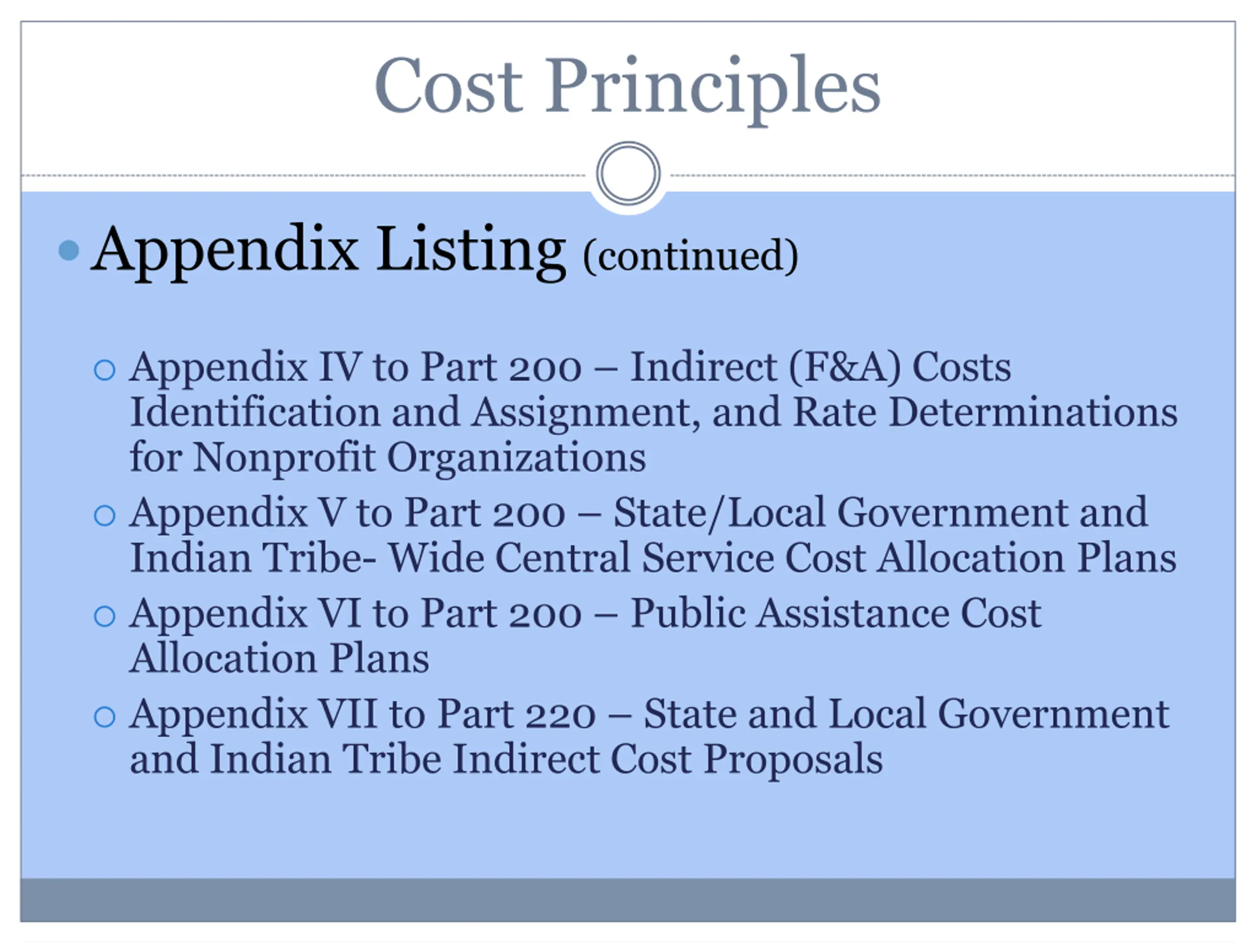 Cost Principles Appendix Listing (continued) Appendix IV to Part 200 Indirect (F&A) Costs Identification and Assignment, and Rate Determinations for Nonprofit Organizations Appendix V to Part 200 State/Local Government and Indian Tribe- Wide Central Service Cost Allocation Plans Appendix VI to Part 200 Public Assistance Cost Allocation Plans Appendix VII to Part 220 State and Local Government and Indian Tribe Indirect Cost Proposals