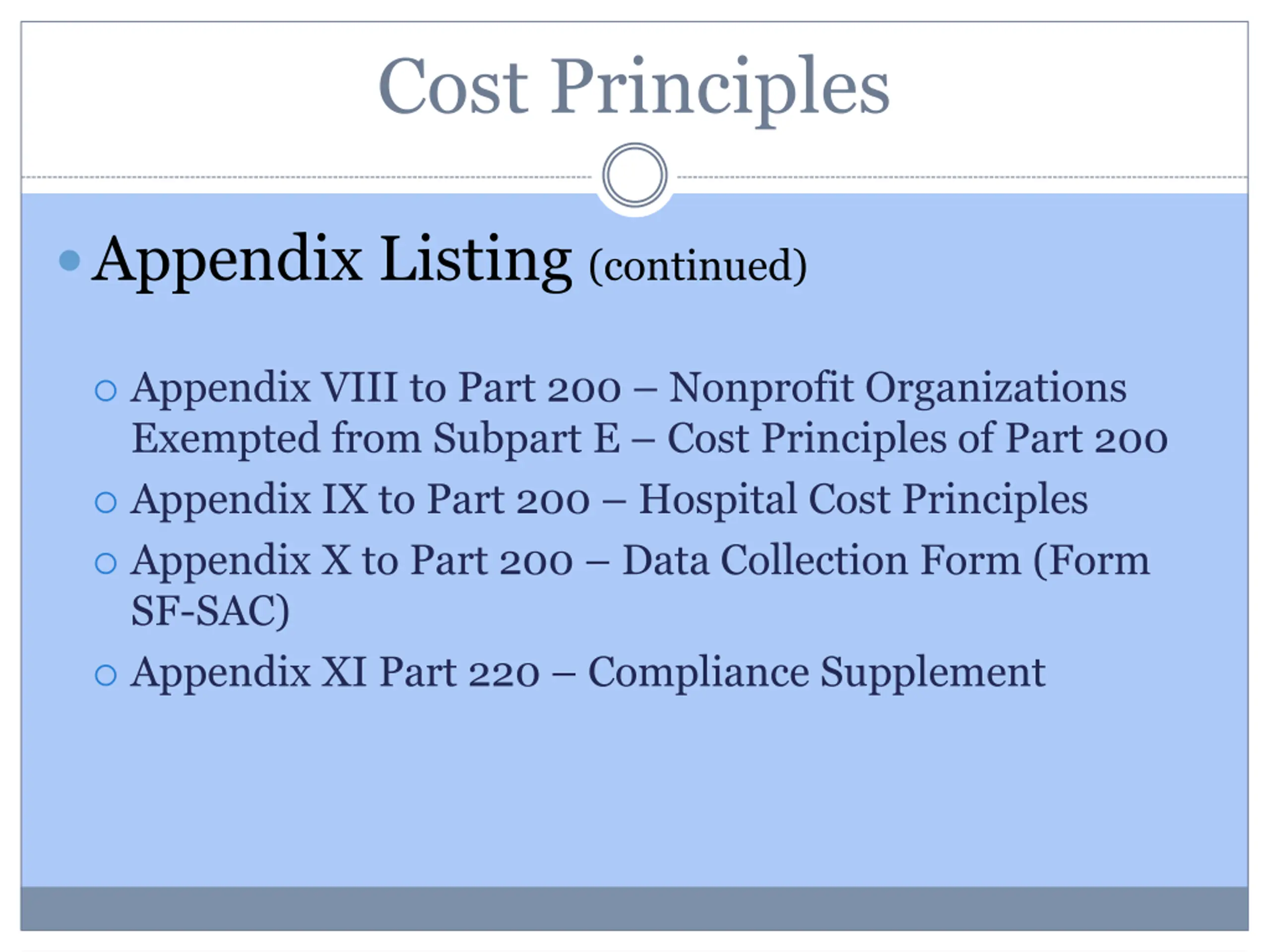 Cost Principles Appendix Listing (continued) Appendix VIII to Part 200 Nonprofit Organizations Exempted from Subpart E Cost Principles of Part 200 Appendix IX to Part 200 Hospital Cost Principles Appendix X to Part 200 Data Collection Form (Form SF-SAC) Appendix XI Part 220 Compliance Supplement
