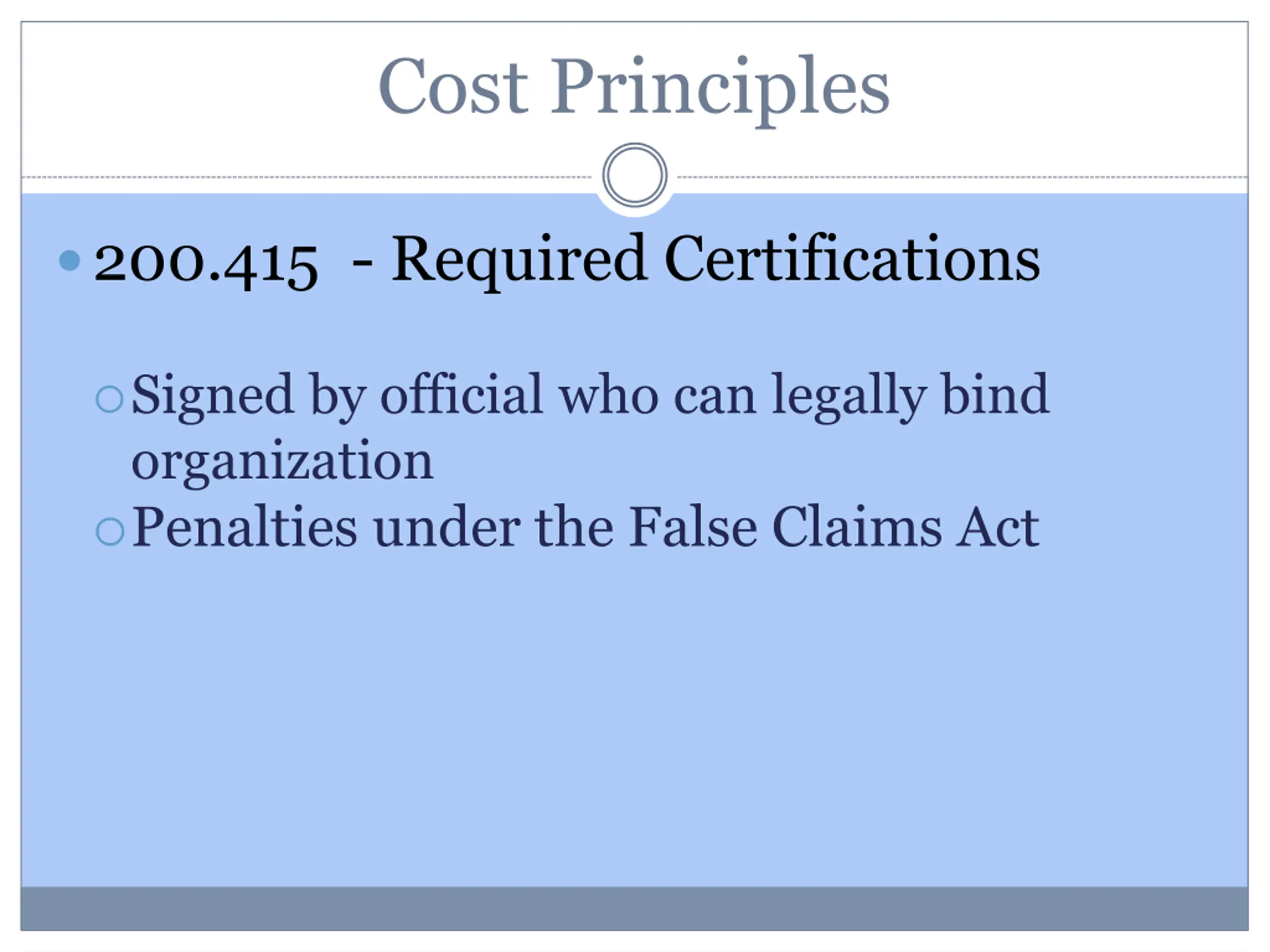 Cost Principles 200.415 - Required Certifications Signed by official who can legally bind organization Penalties under the False Claims Act