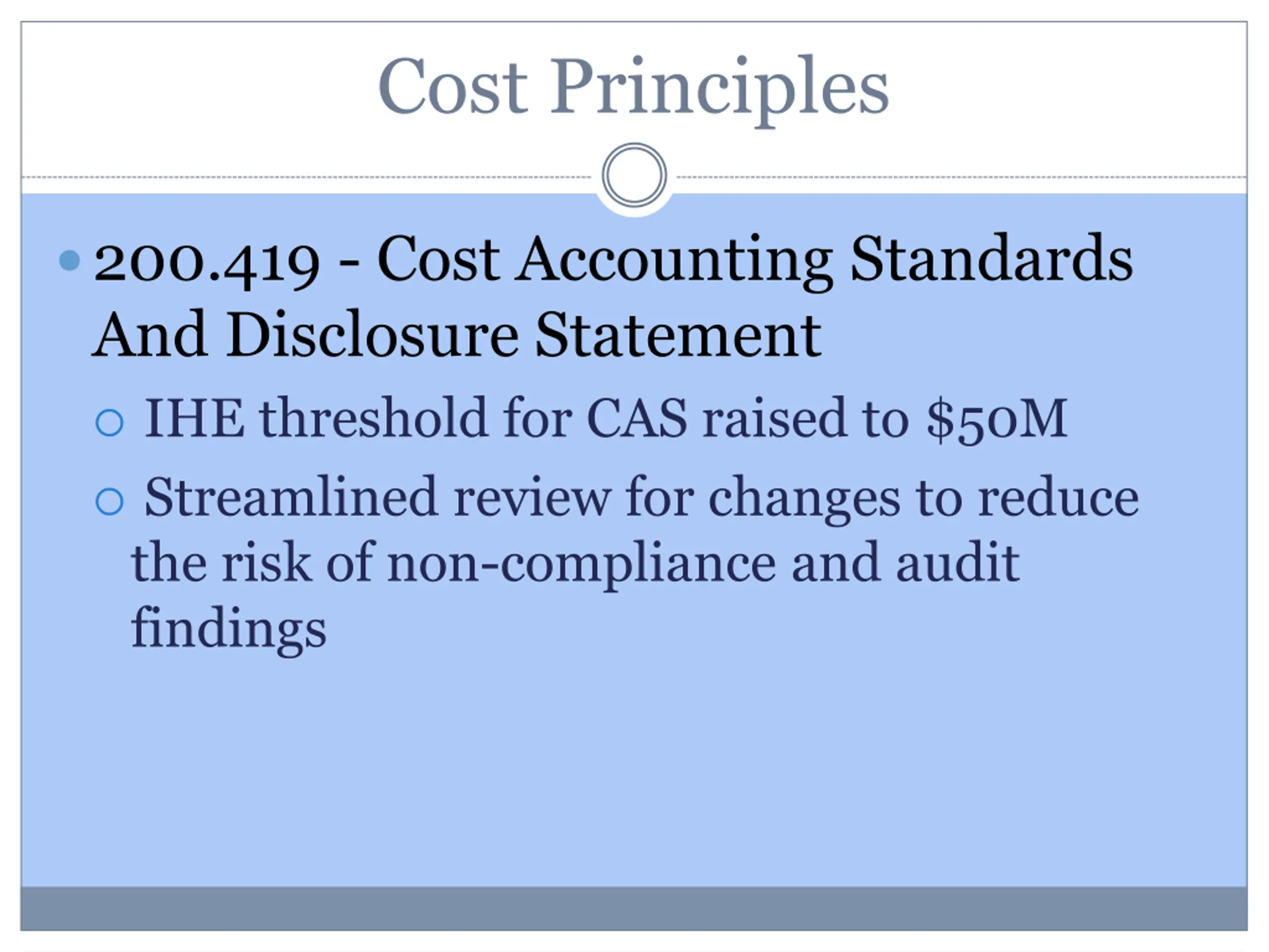 Cost Principles 200.419 - Cost Accounting Standards And Disclosure Statement IHE threshold for CAS raised to $50M Streamlined review for changes to reduce the risk of non-compliance and audit findings