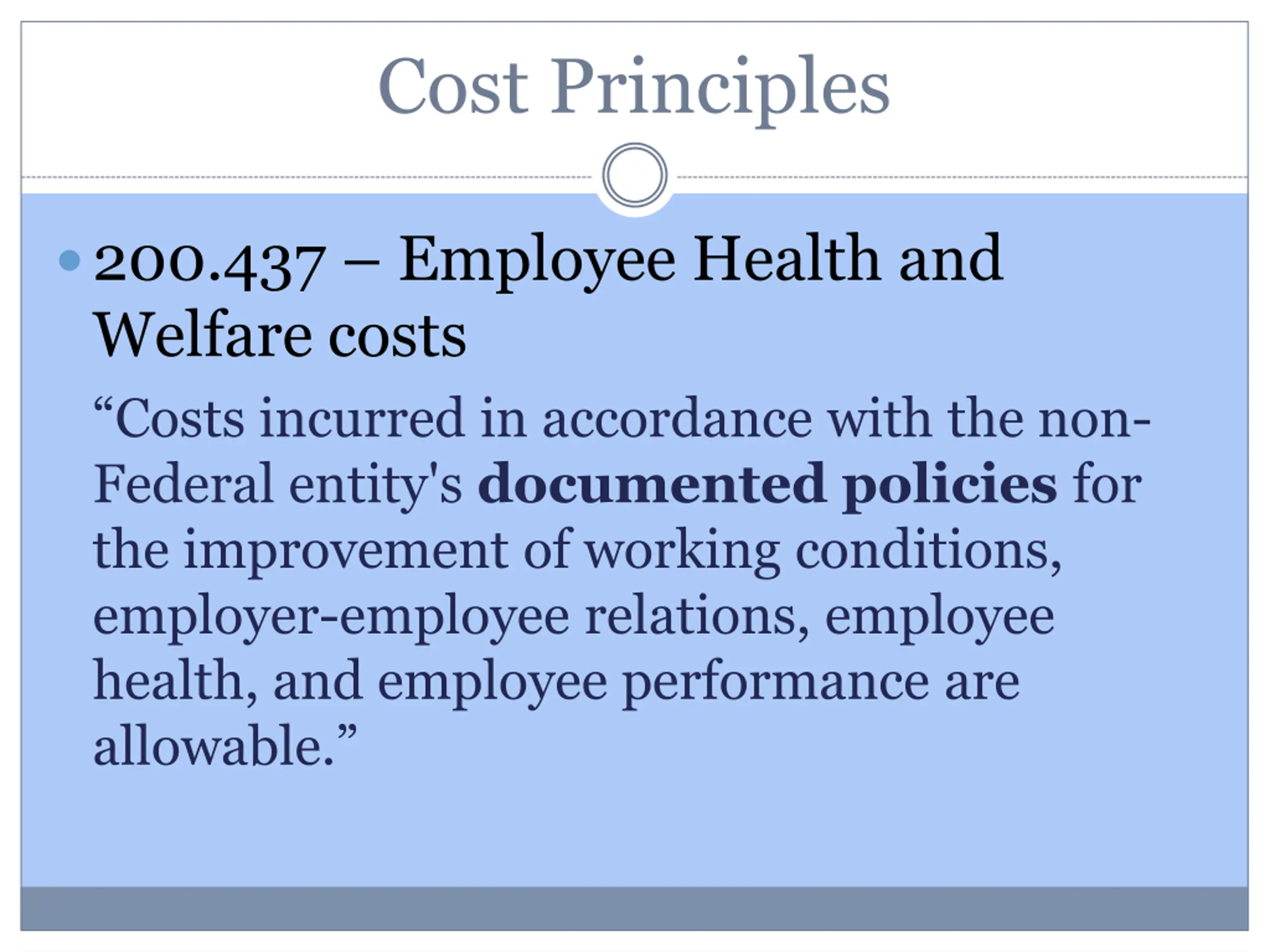 Cost Principles 200.437 Employee Health and Welfare costs Costs incurred in accordance with the non- Federal entity's documented policies for the improvement of working conditions, employer-employee relations, employee health, and employee performance are allowable.