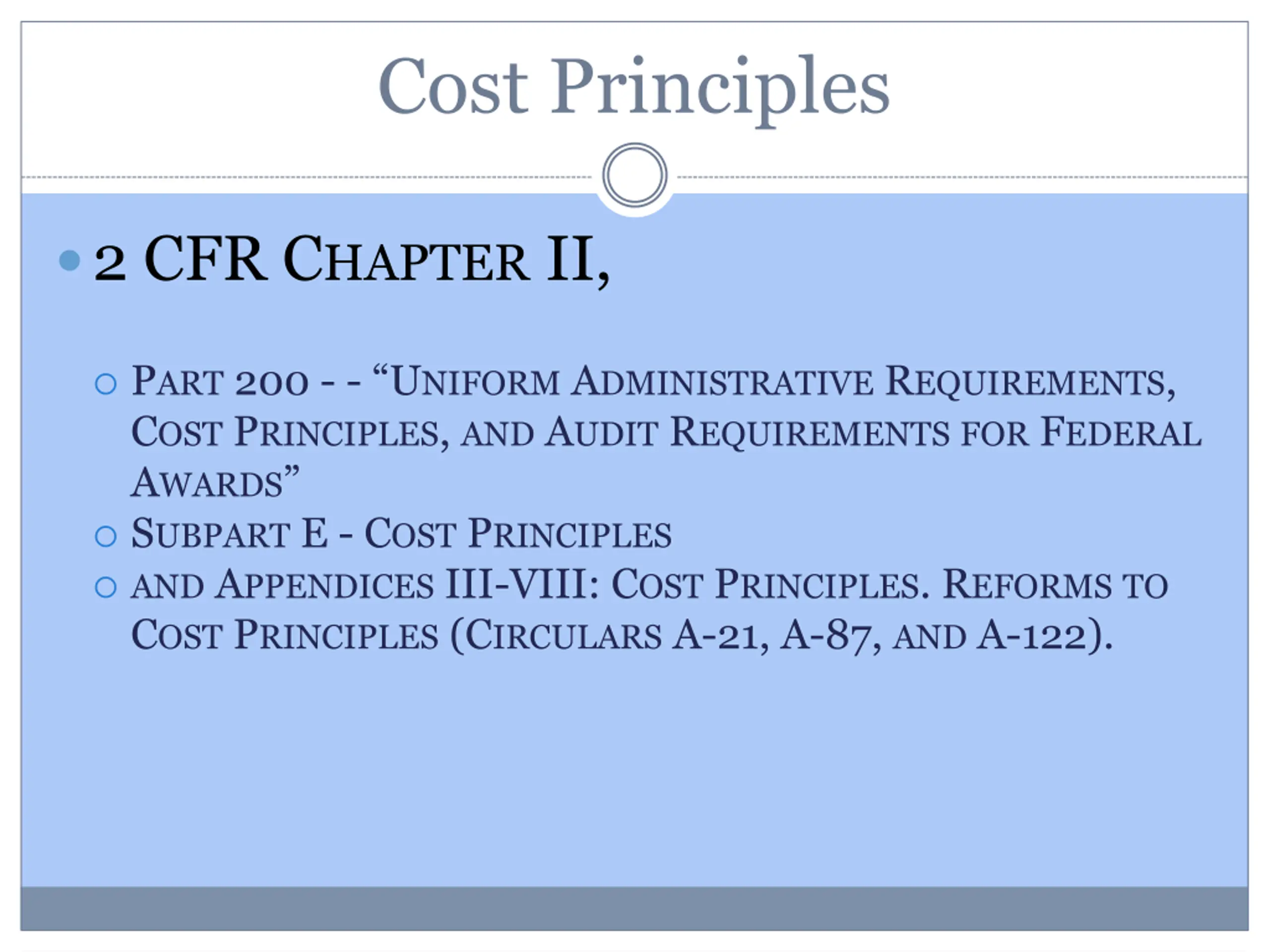 Cost Principles 2 CFR CHAPTER II, PART 200 - - UNIFORM ADMINISTRATIVE REQUIREMENTS, COST PRINCIPLES, AND AUDIT REQUIREMENTSFOR FEDERAL AWARDS SUBPART E - COST PRINCIPLES AND APPENDICES III-VIII: COST PRINCIPLES. REFORMSTO COST PRINCIPLES (CIRCULARS A-21, A-87, AND A-122).