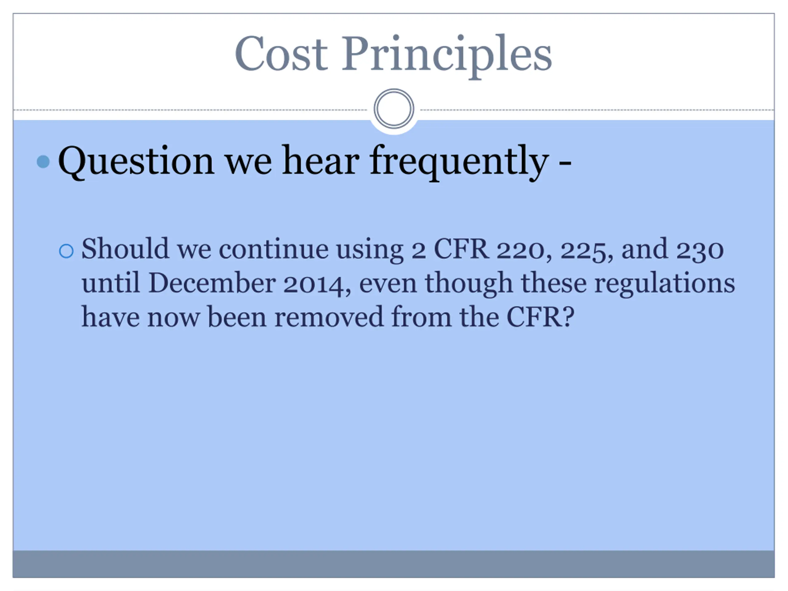 Cost Principles Question we hear frequently - Should we continue using 2 CFR 220, 225, and 230 until December 2014, even though these regulations have now been removed from the CFR?