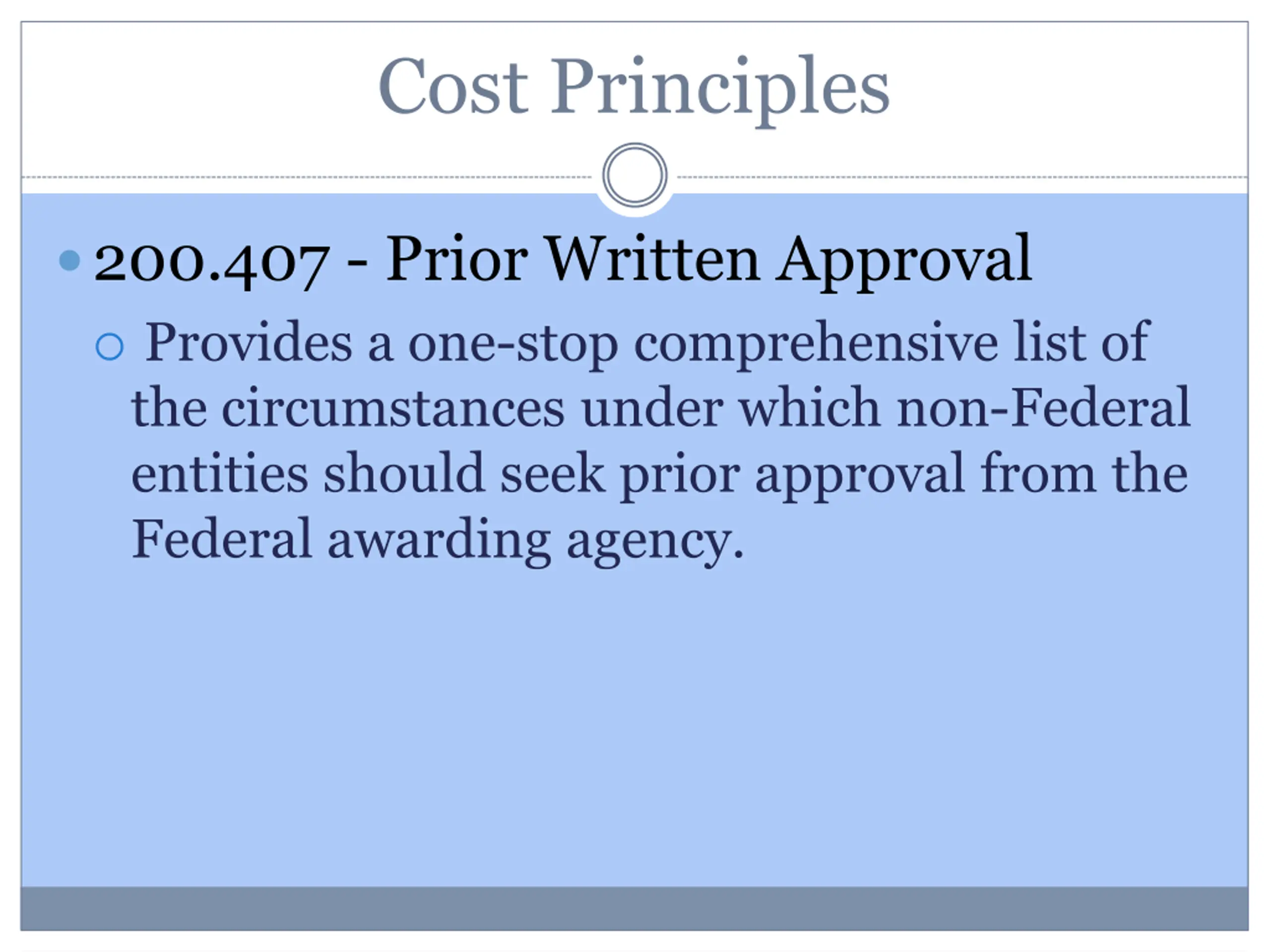 Cost Principles 200.407 - Prior Written Approval Provides a one-stop comprehensive list of the circumstances under which non-Federal entities should seek prior approval from the Federal awarding agency.