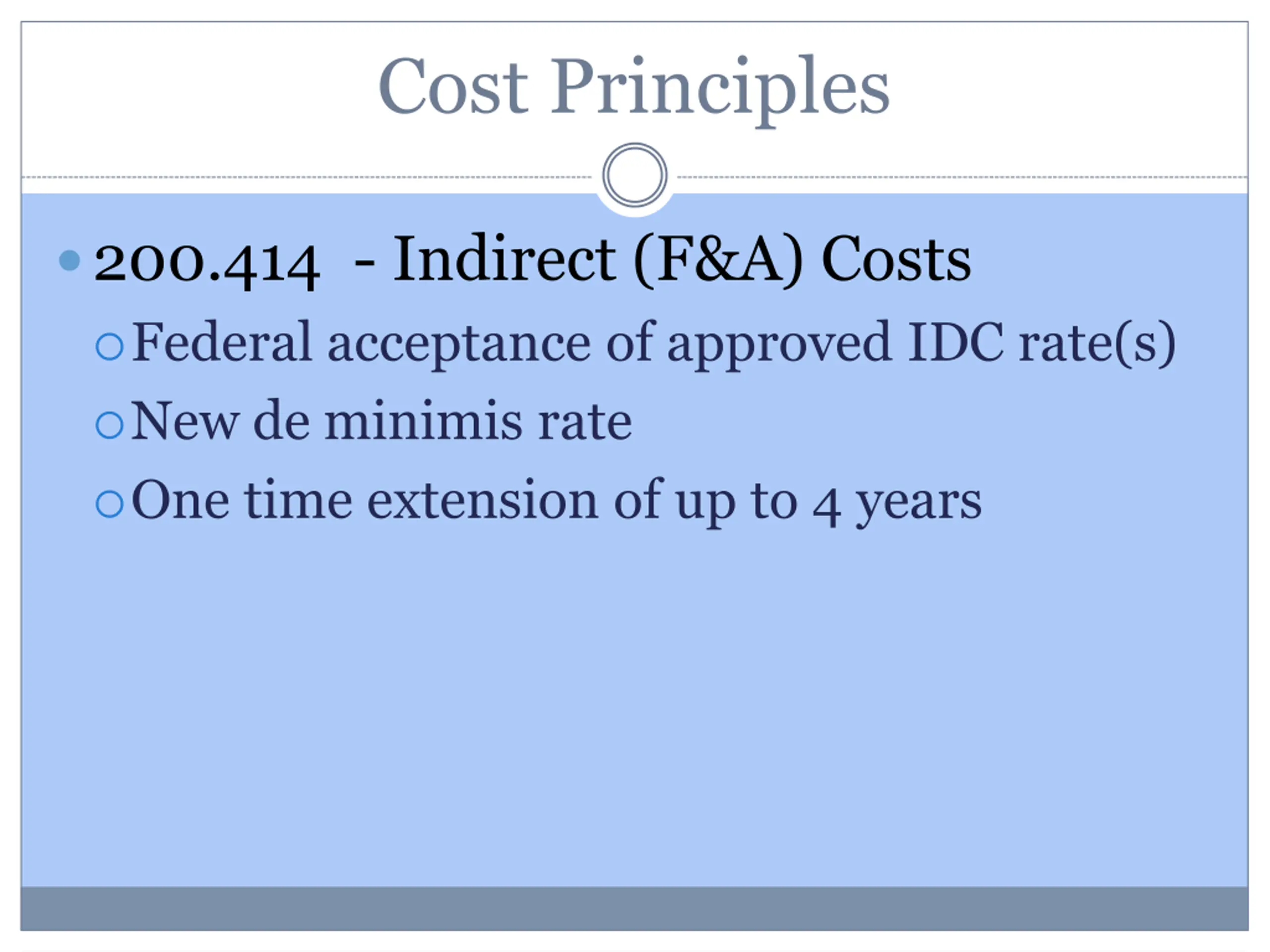 Cost Principles 200.414 - Indirect (F&A) Costs Federal acceptance of approved IDC rate(s) New de minimis rate One time extension of up to 4 years