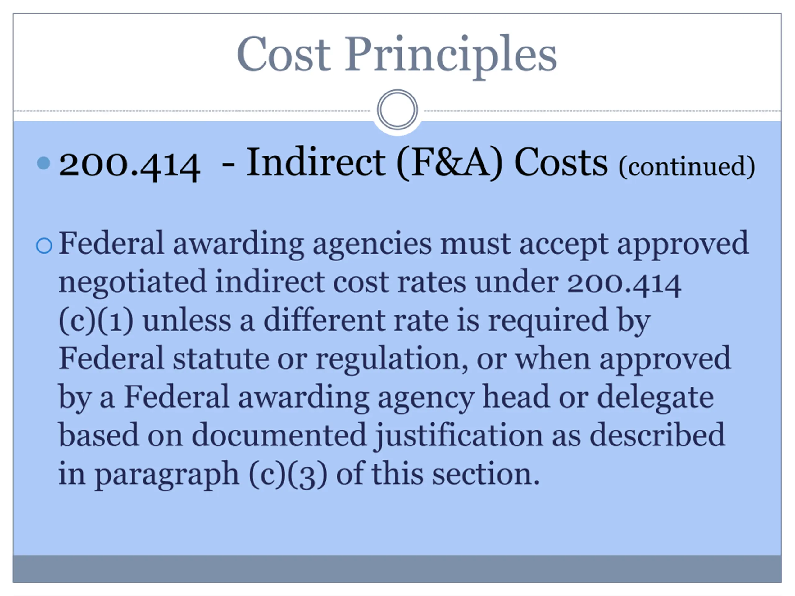 Cost Principles 200.414 - Indirect (F&A) Costs (continued) Federal awarding agencies must accept approved negotiated indirect cost rates under 200.414 (c)(1) unless a different rate is required by Federal statute or regulation, or when approved by a Federal awarding agency head or delegate based on documented justification as described in paragraph (c)(3) of this section.